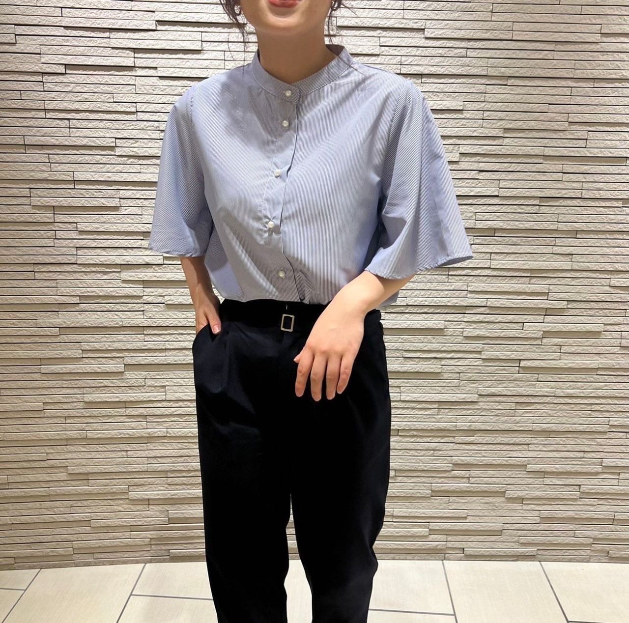 【バンドカラーストライプパールブラウスシャツ】