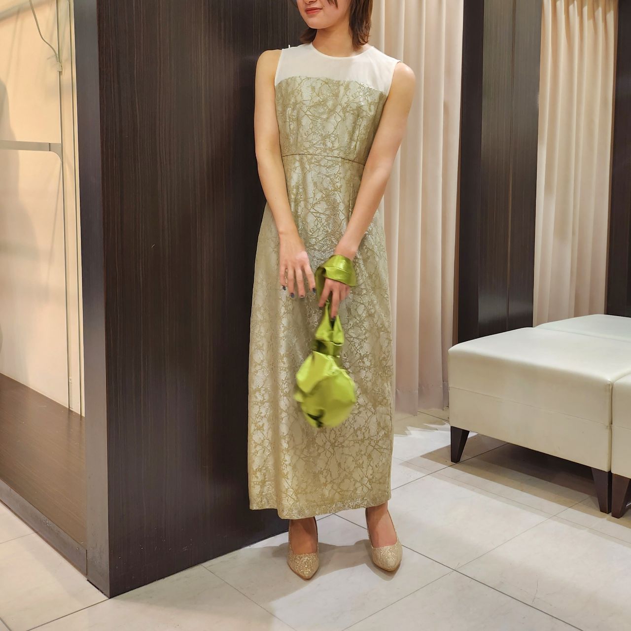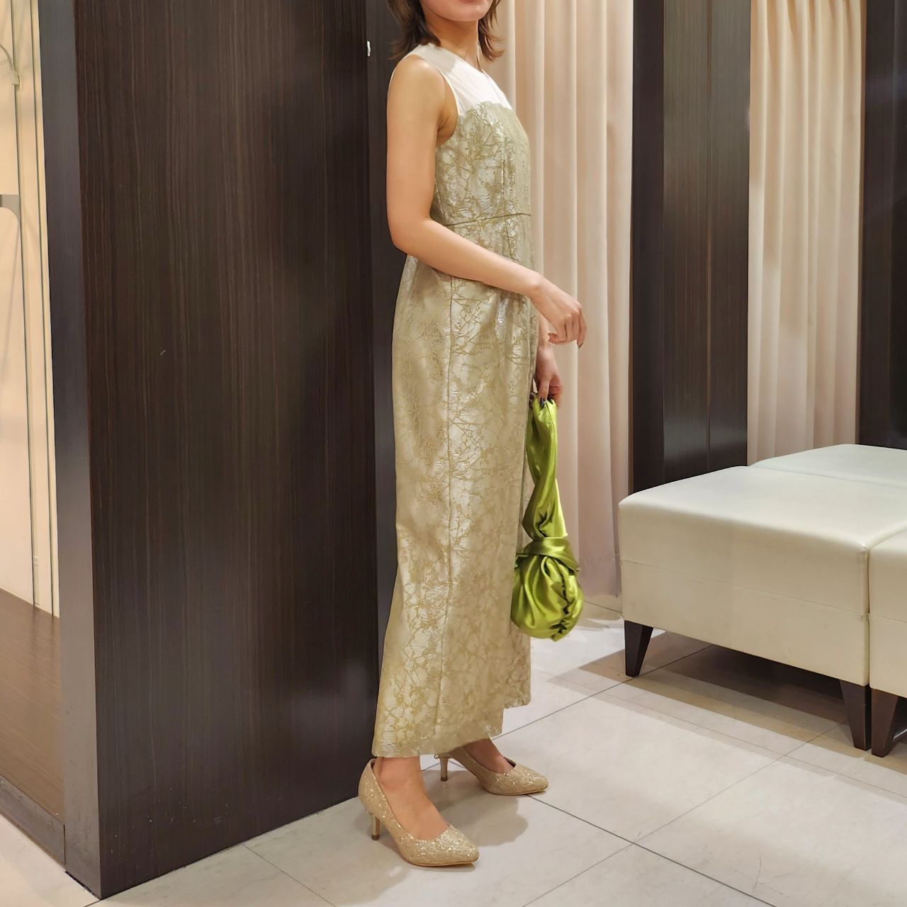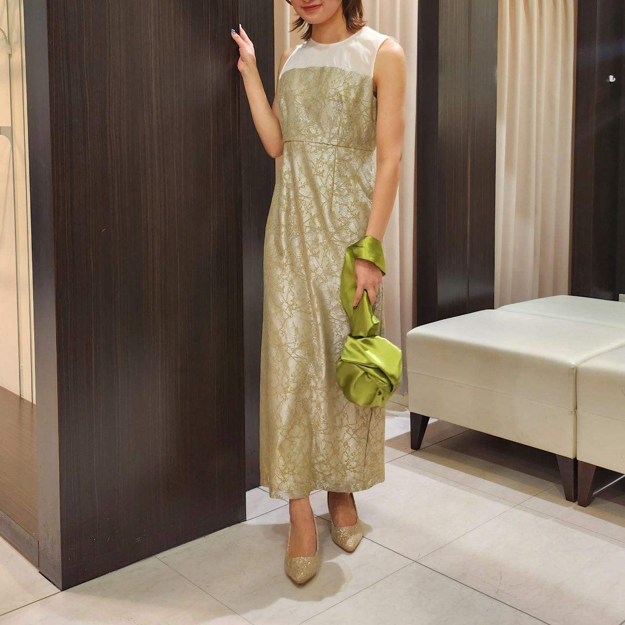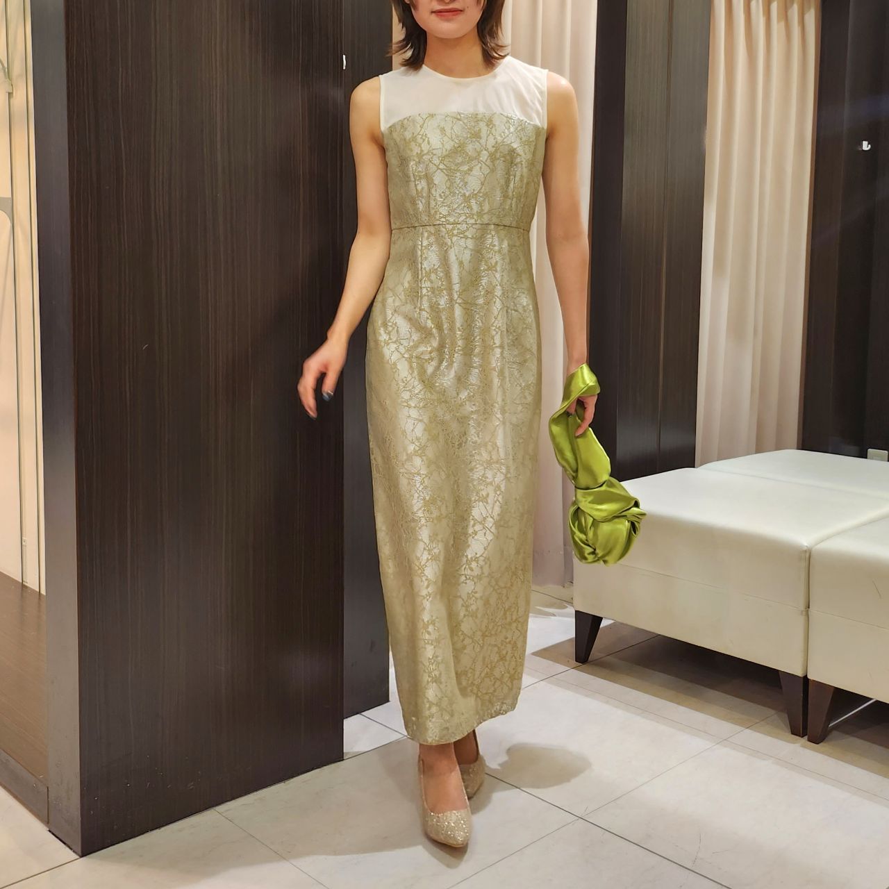 ワンピースドレスは少し光沢感がある上品な刺繍があしらわれており、すっきりとしたシャープなシルエットです♪