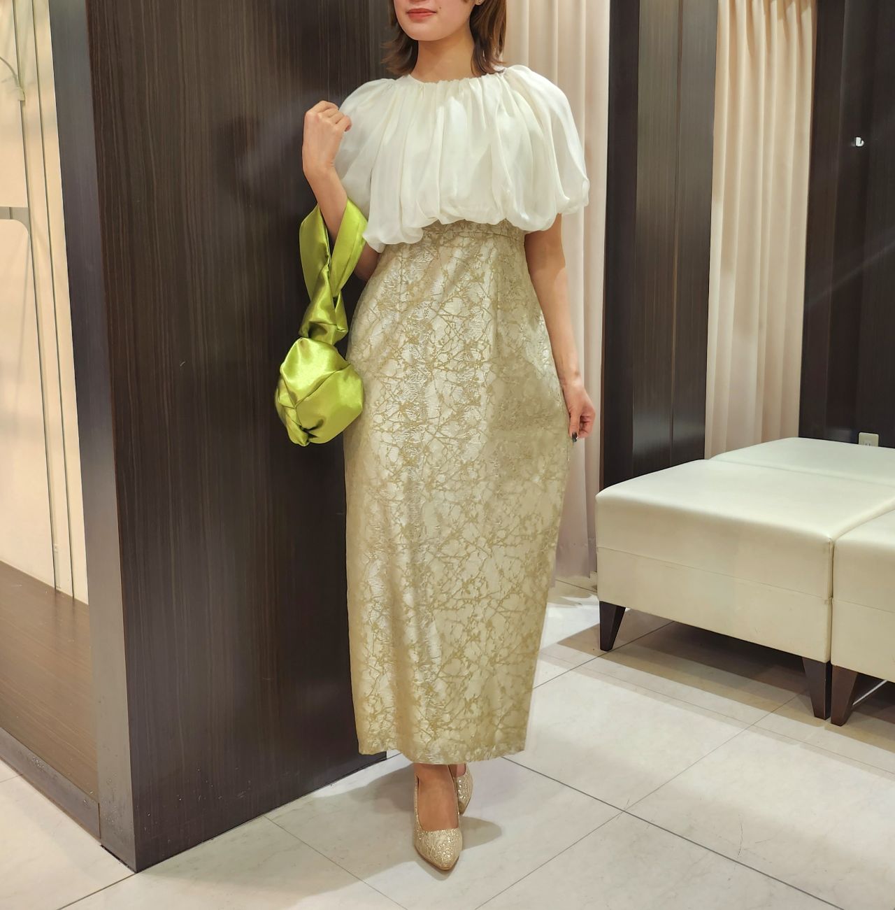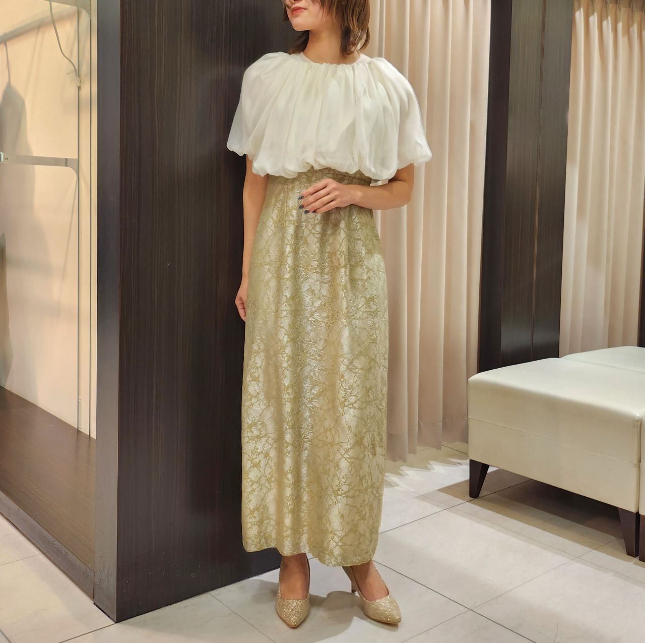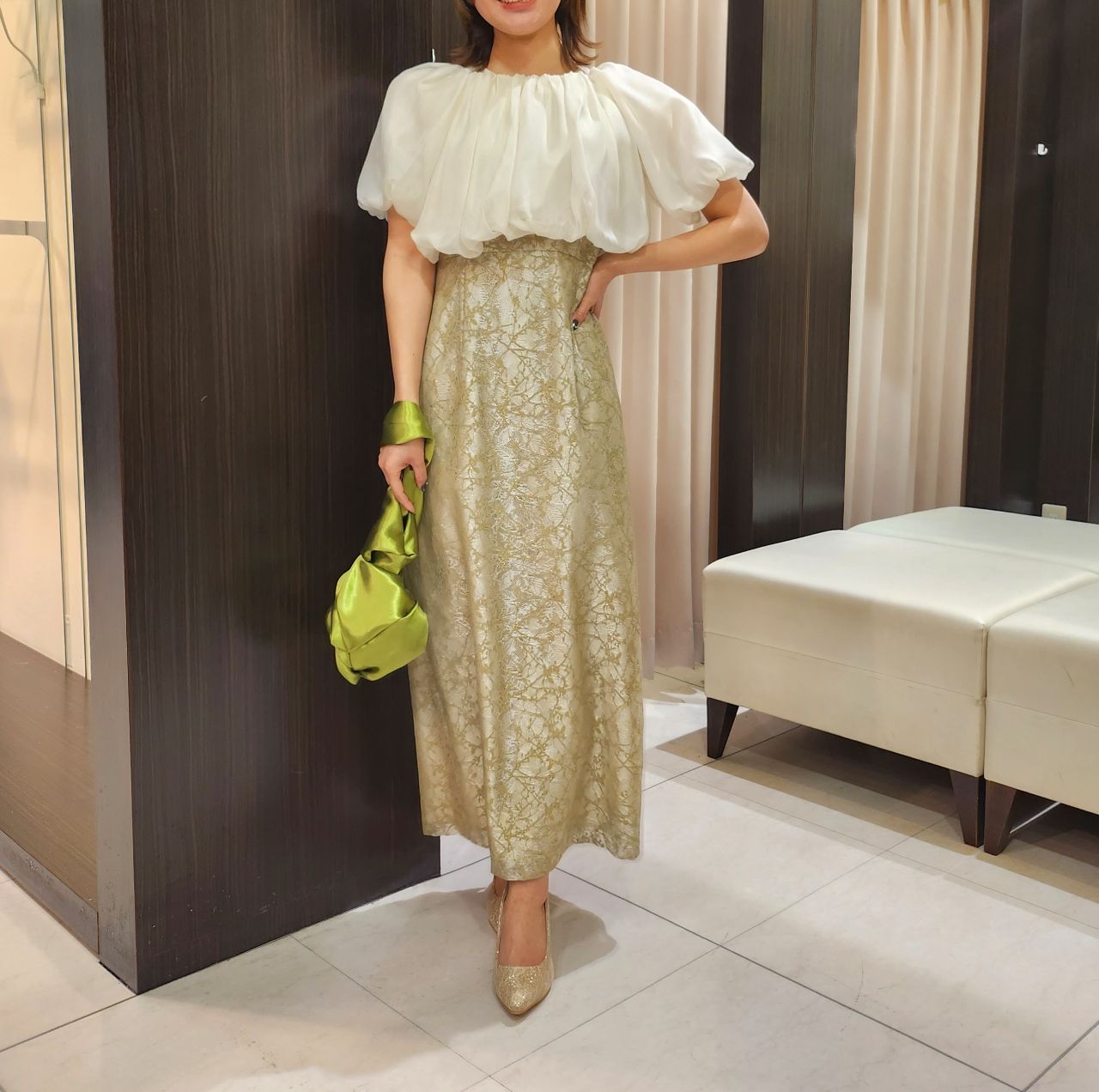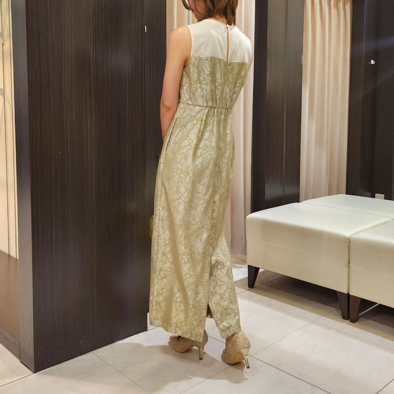 ワンピースドレスは少し光沢感がある上品な刺繍があしらわれており、すっきりとしたシャープなシルエットです♪