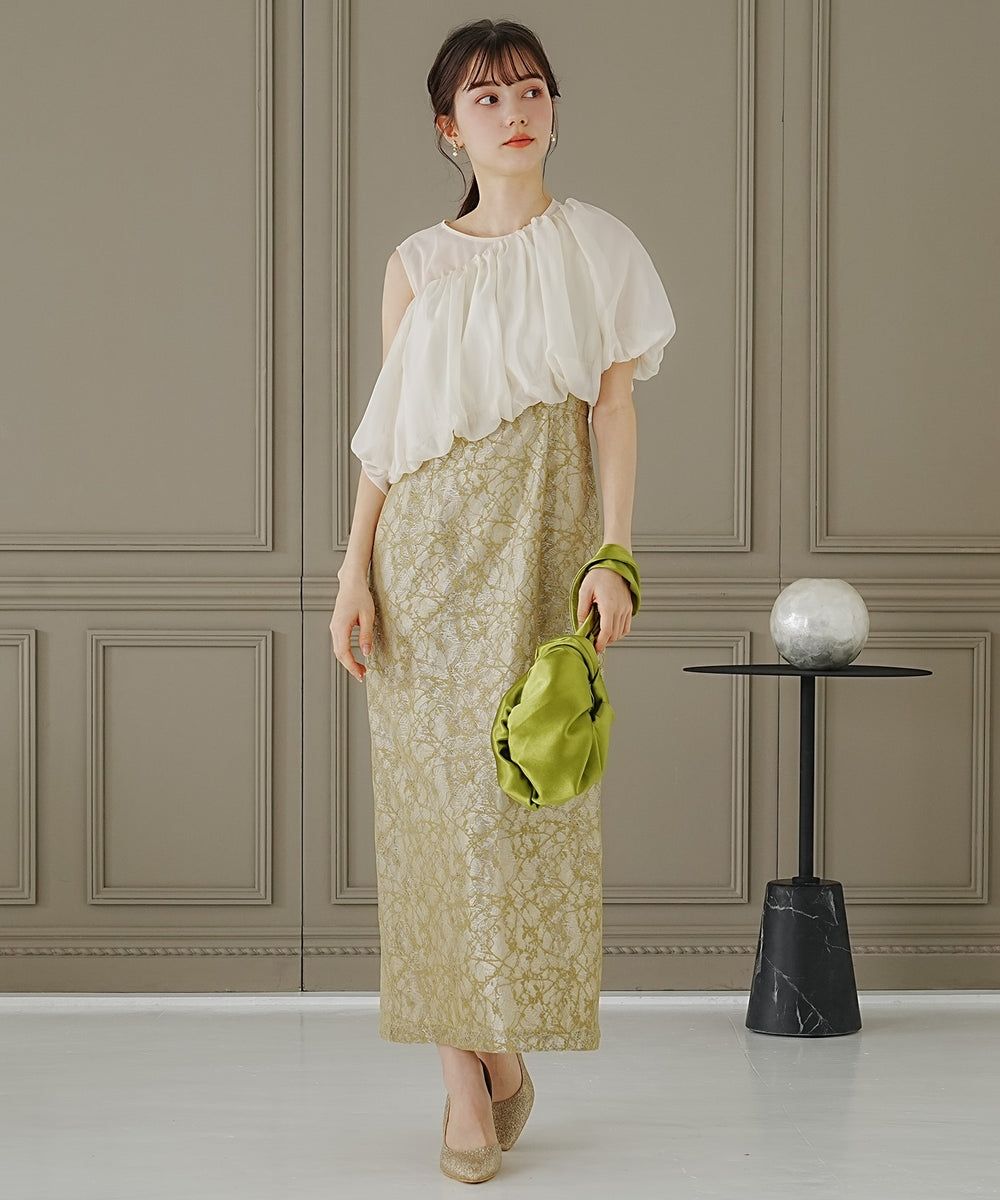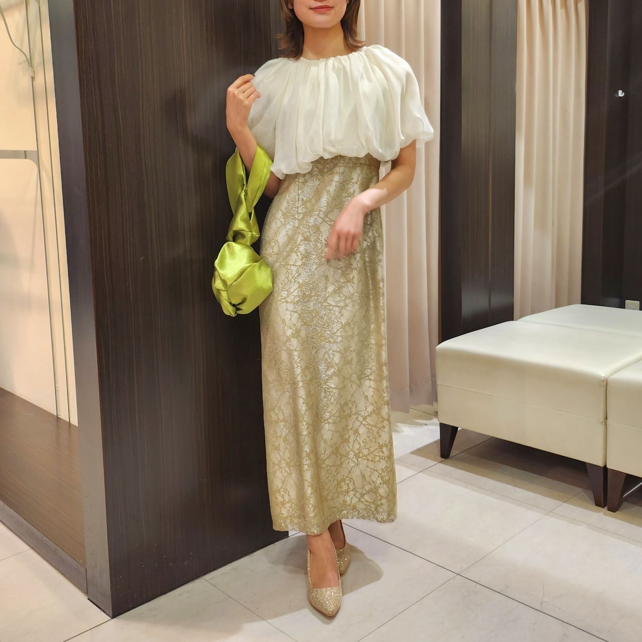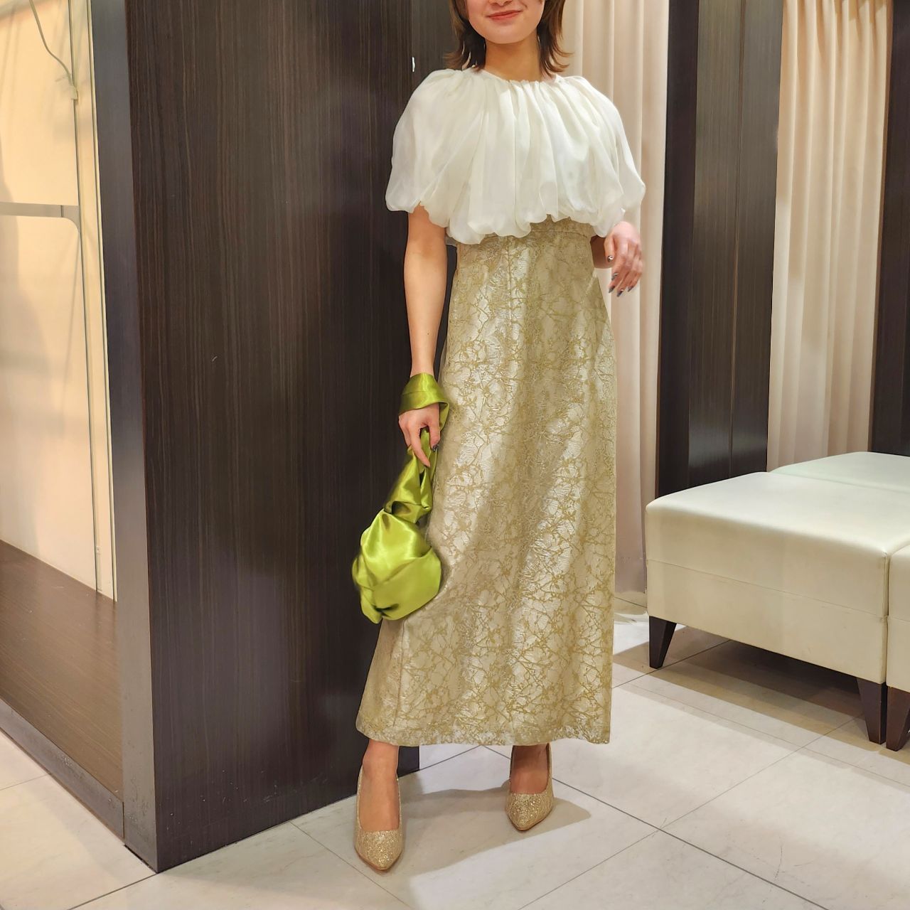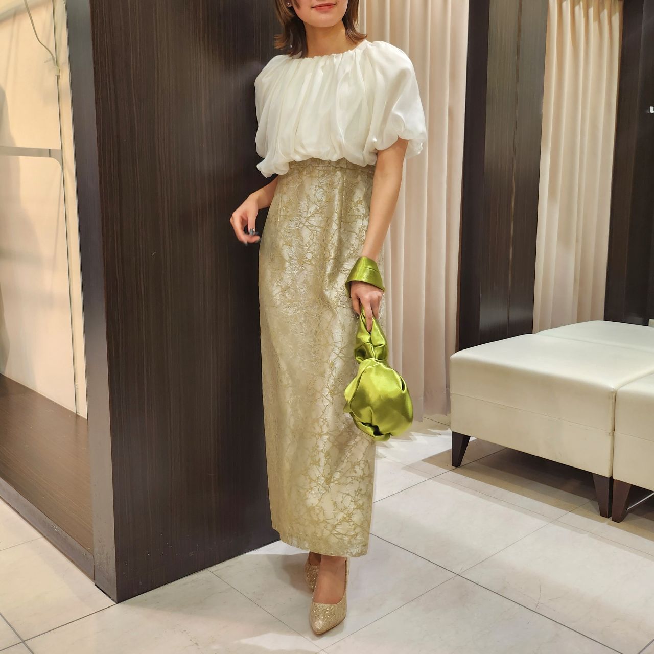 ワンピースドレスは少し光沢感がある上品な刺繍があしらわれており、すっきりとしたシャープなシルエットです♪