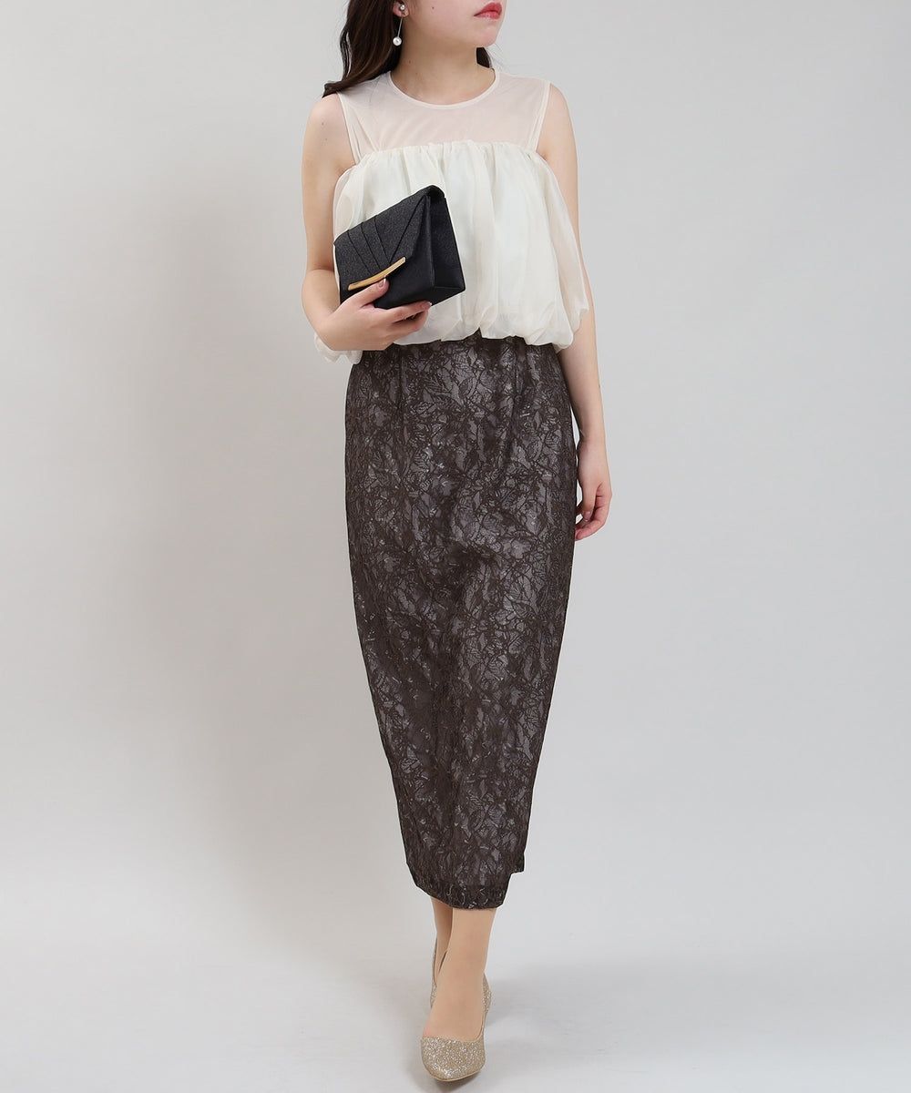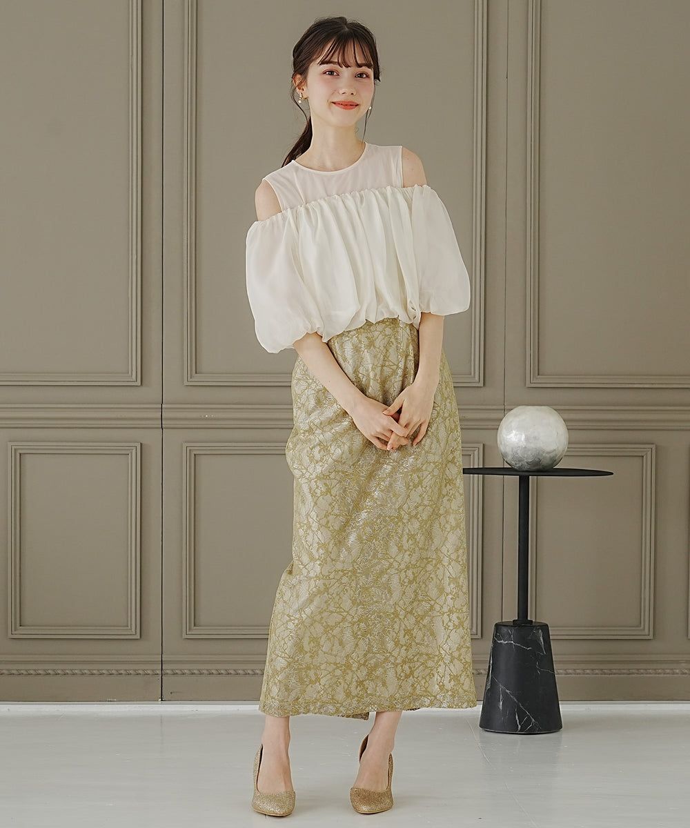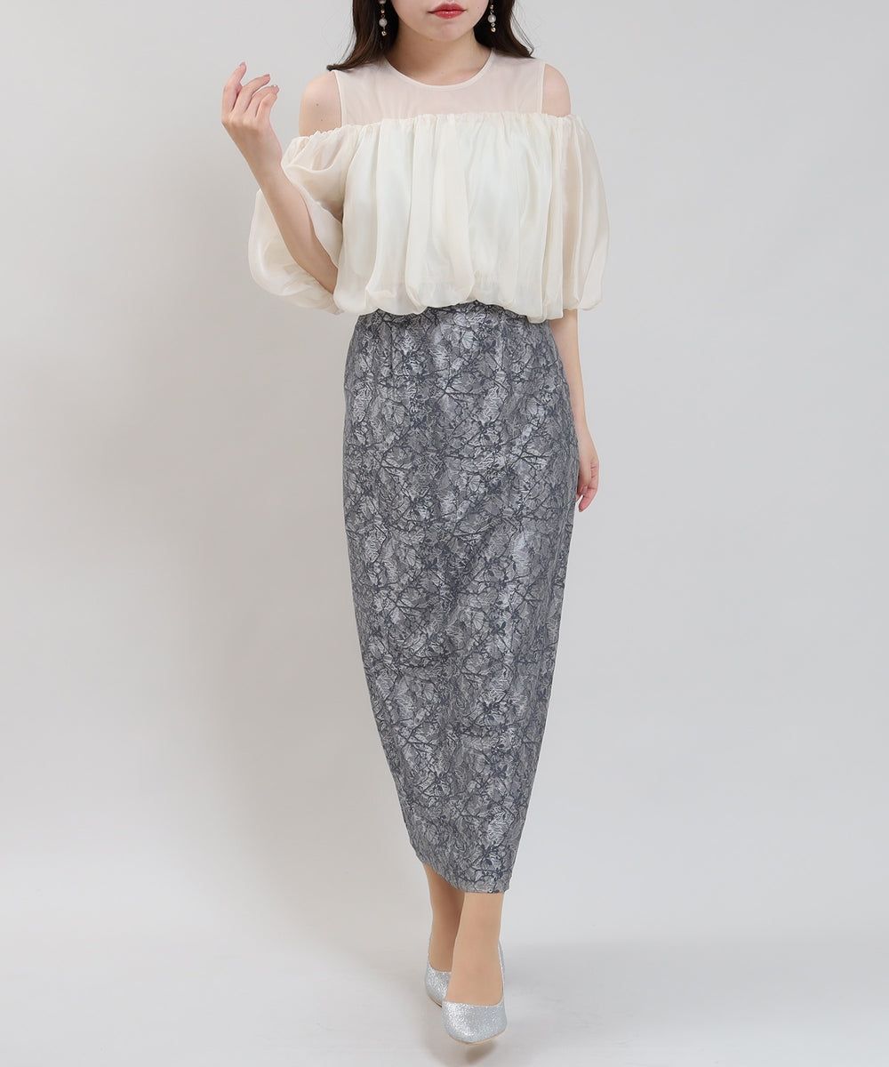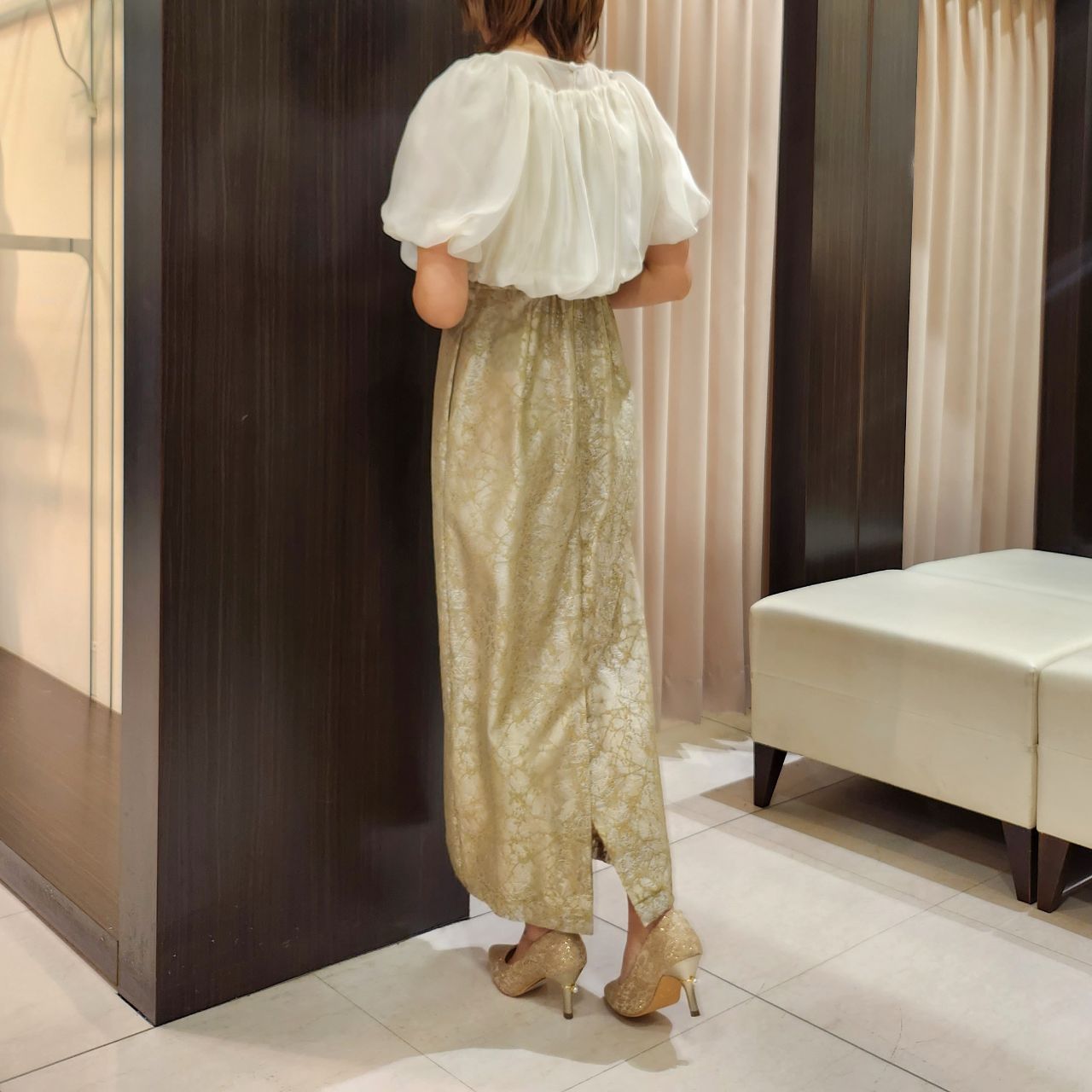 ワンピースドレスは少し光沢感がある上品な刺繍があしらわれており、すっきりとしたシャープなシルエットです♪
