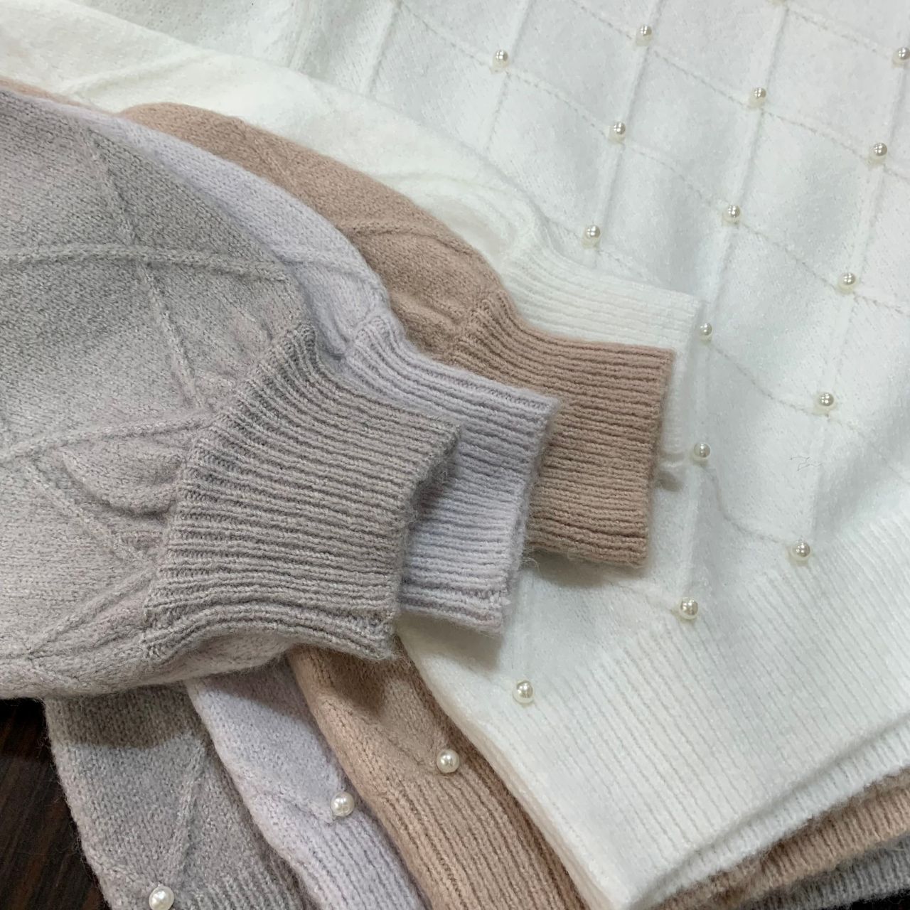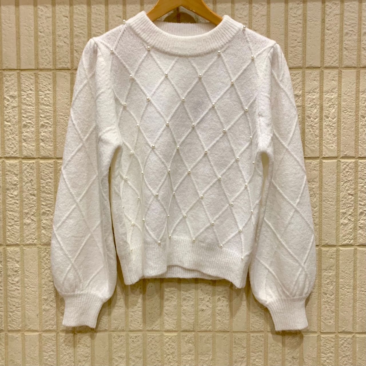 【フラッフィーパール装飾ダイア柄ニット】