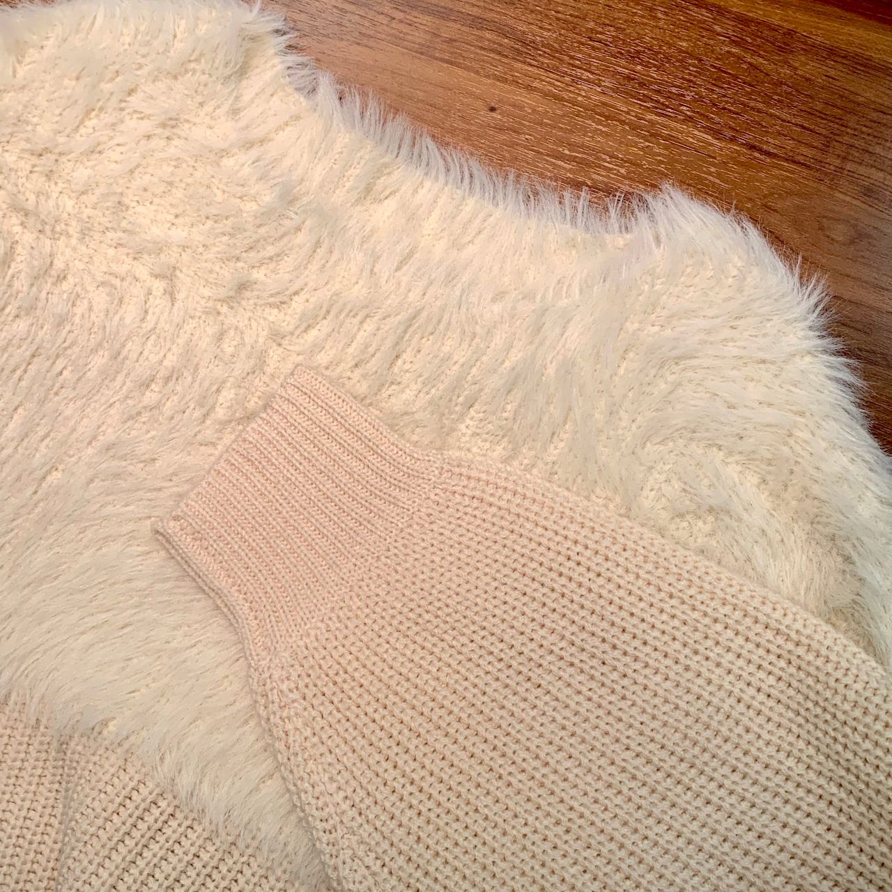 ふわふわシャギーとニットの切替がポイントの