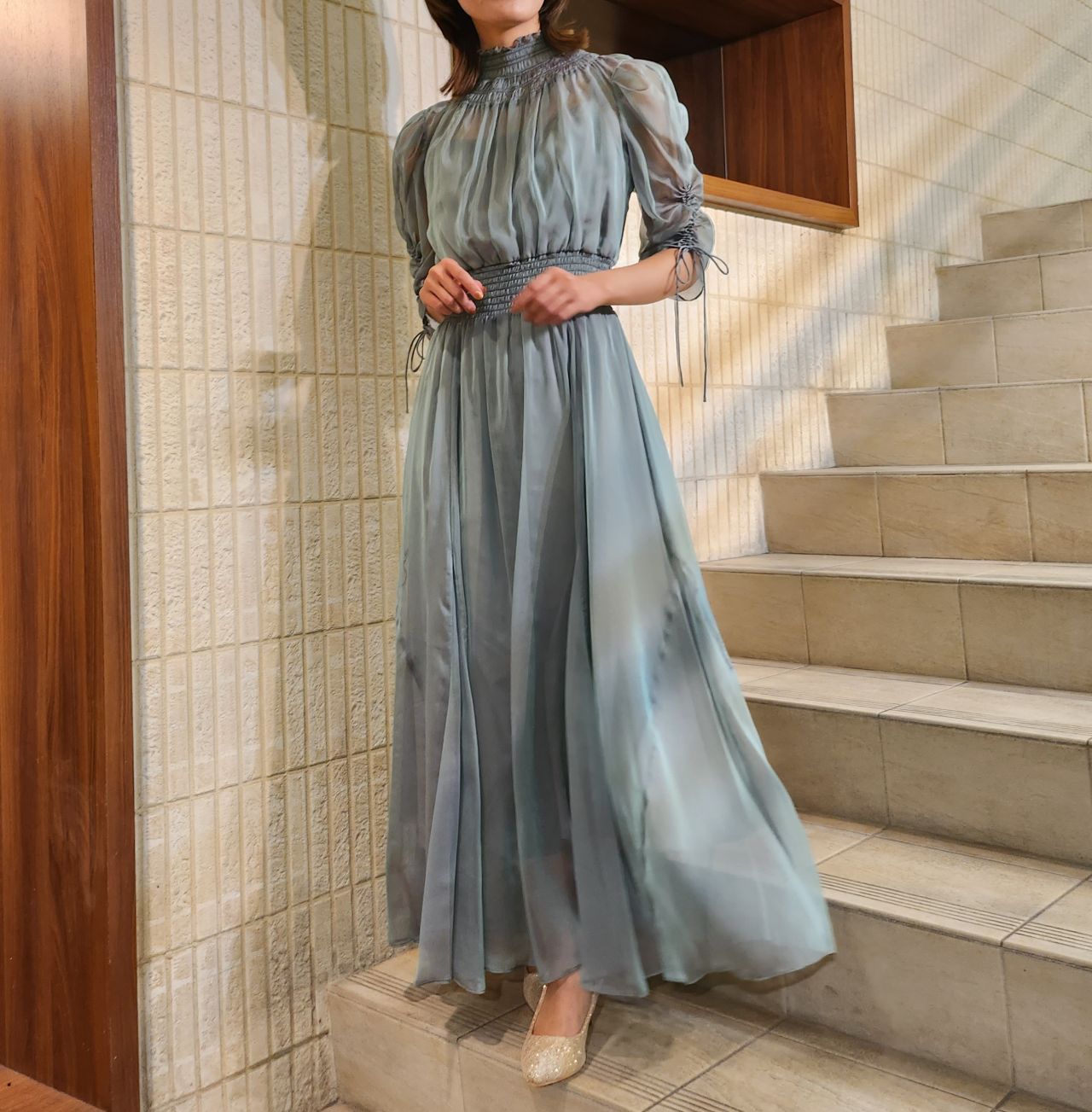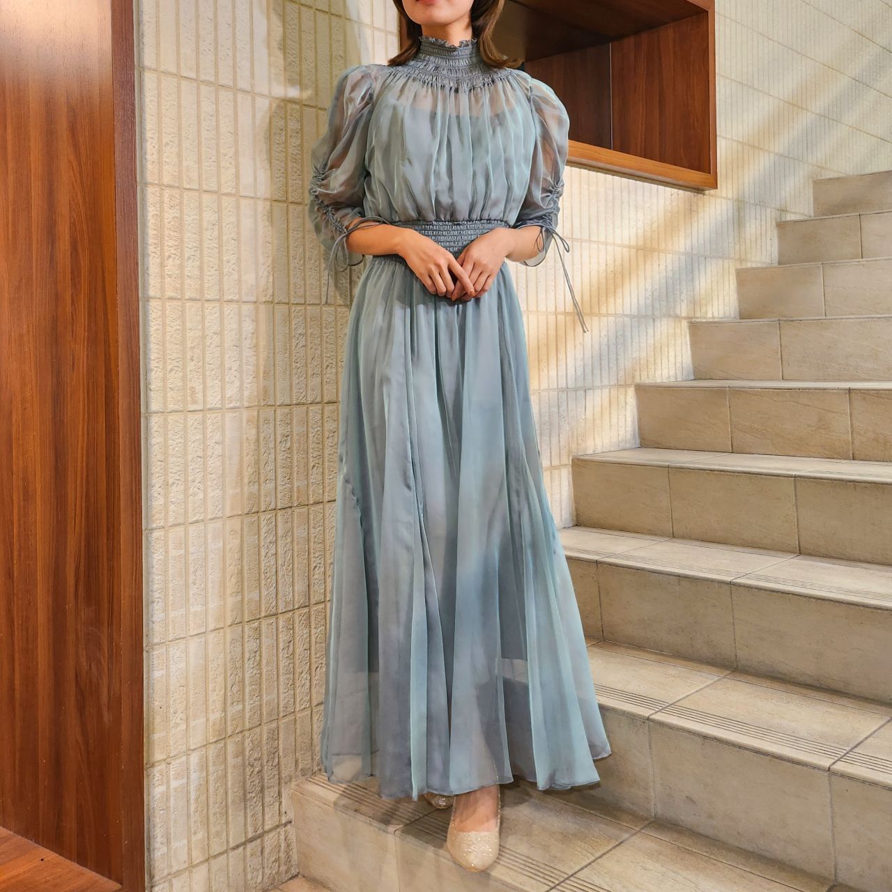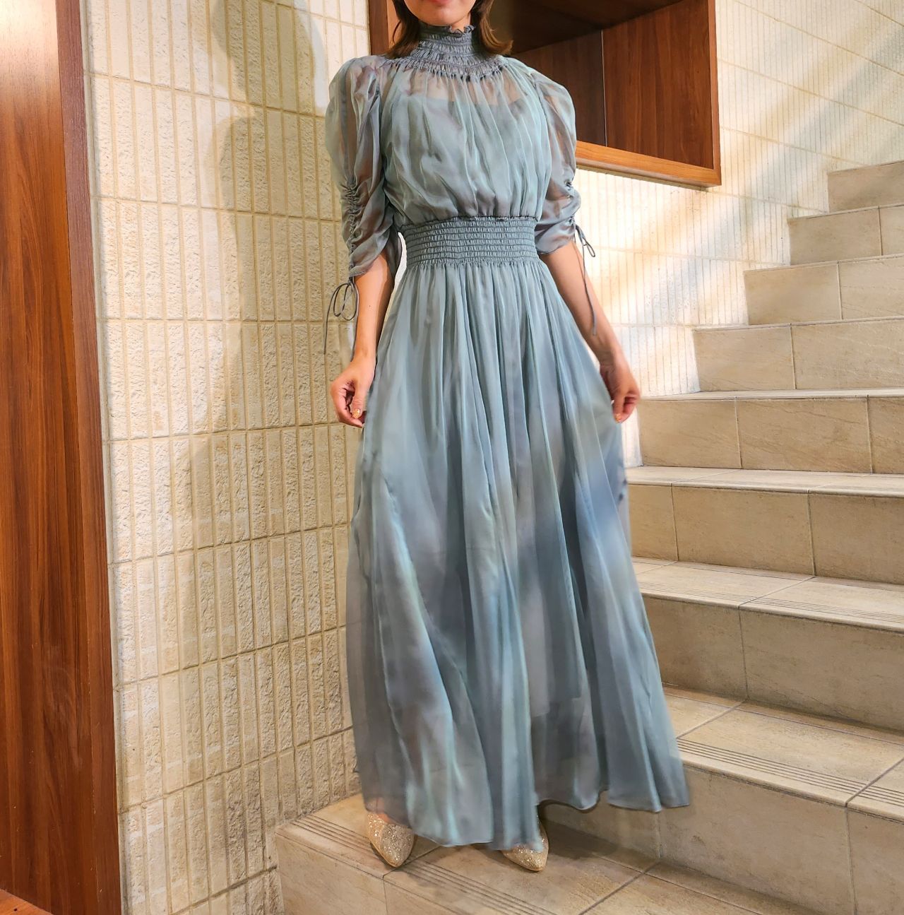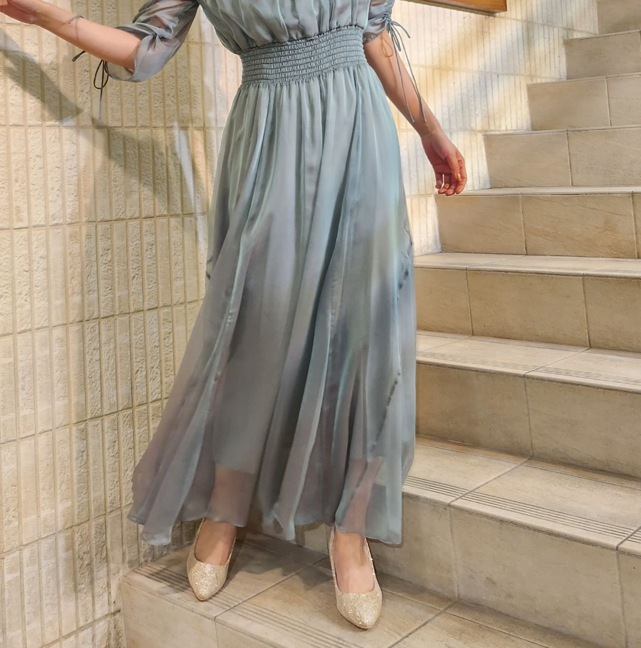 美しく繊細な透け感とシャーリングの組み合わせがどこかクラシカルな印象にしてくれます♪