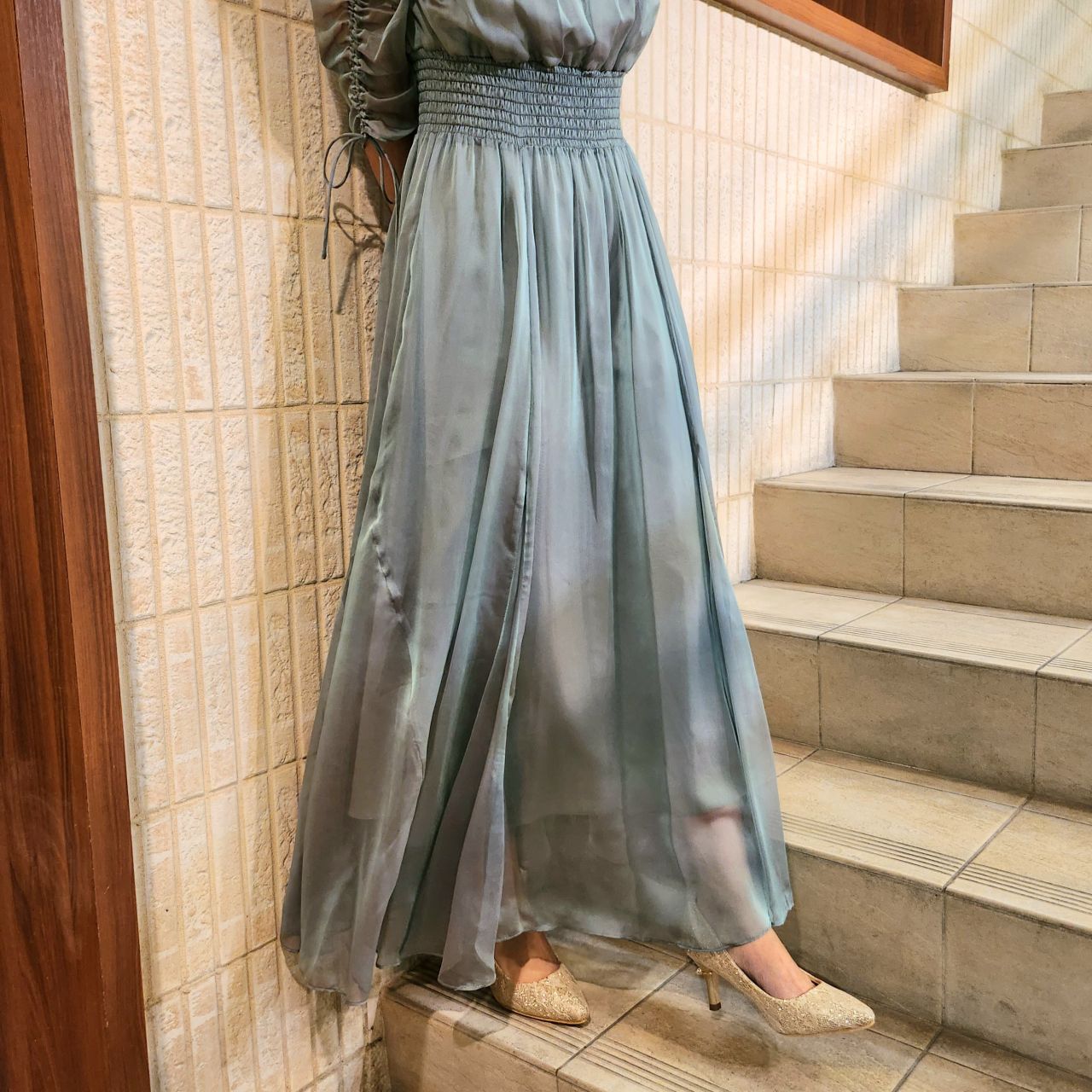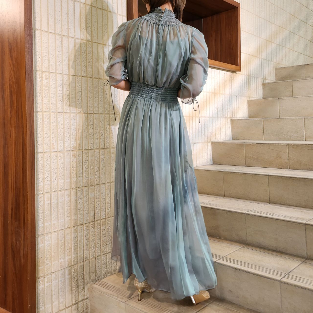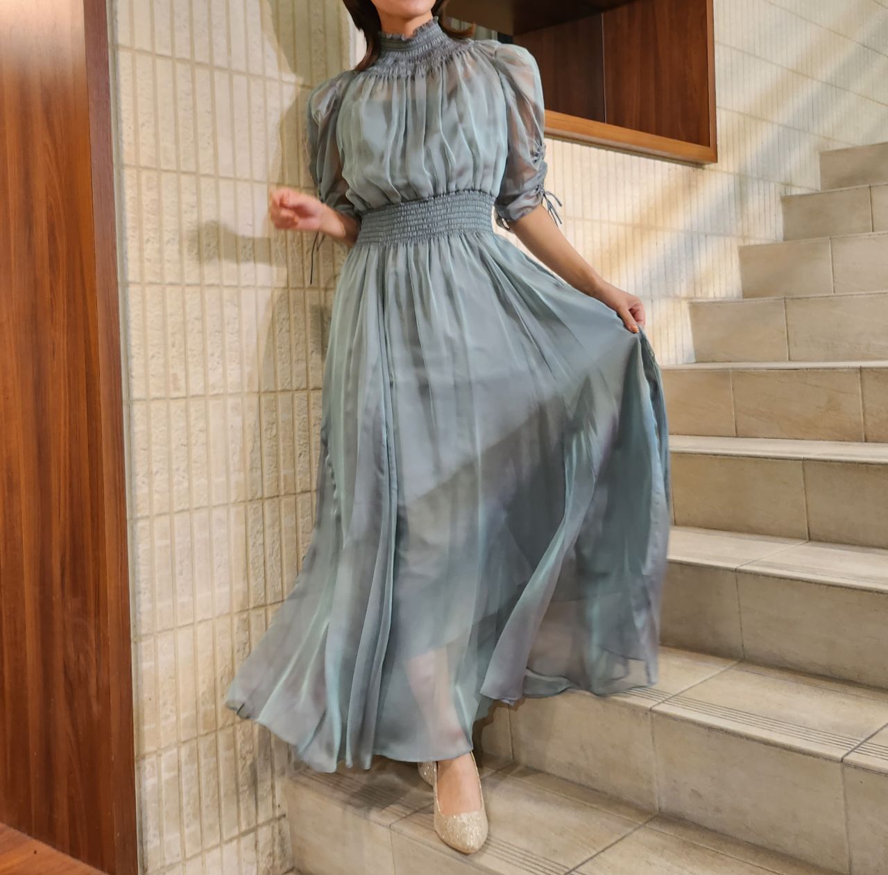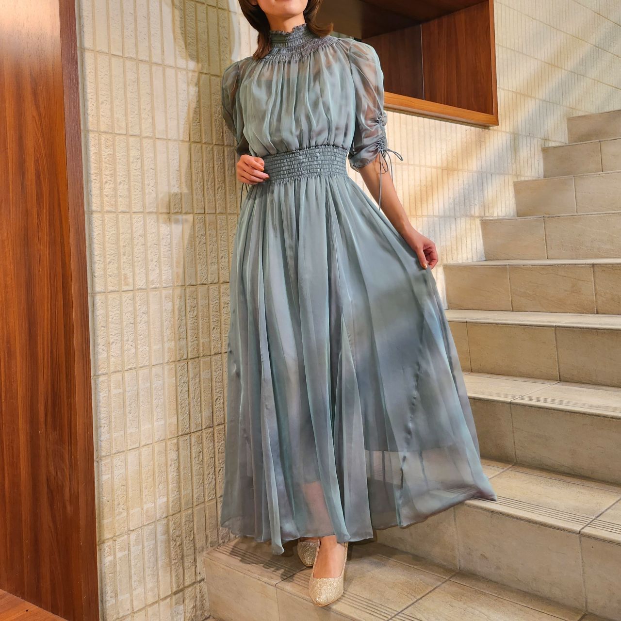 美しく繊細な透け感とシャーリングの組み合わせがどこかクラシカルな印象にしてくれます♪