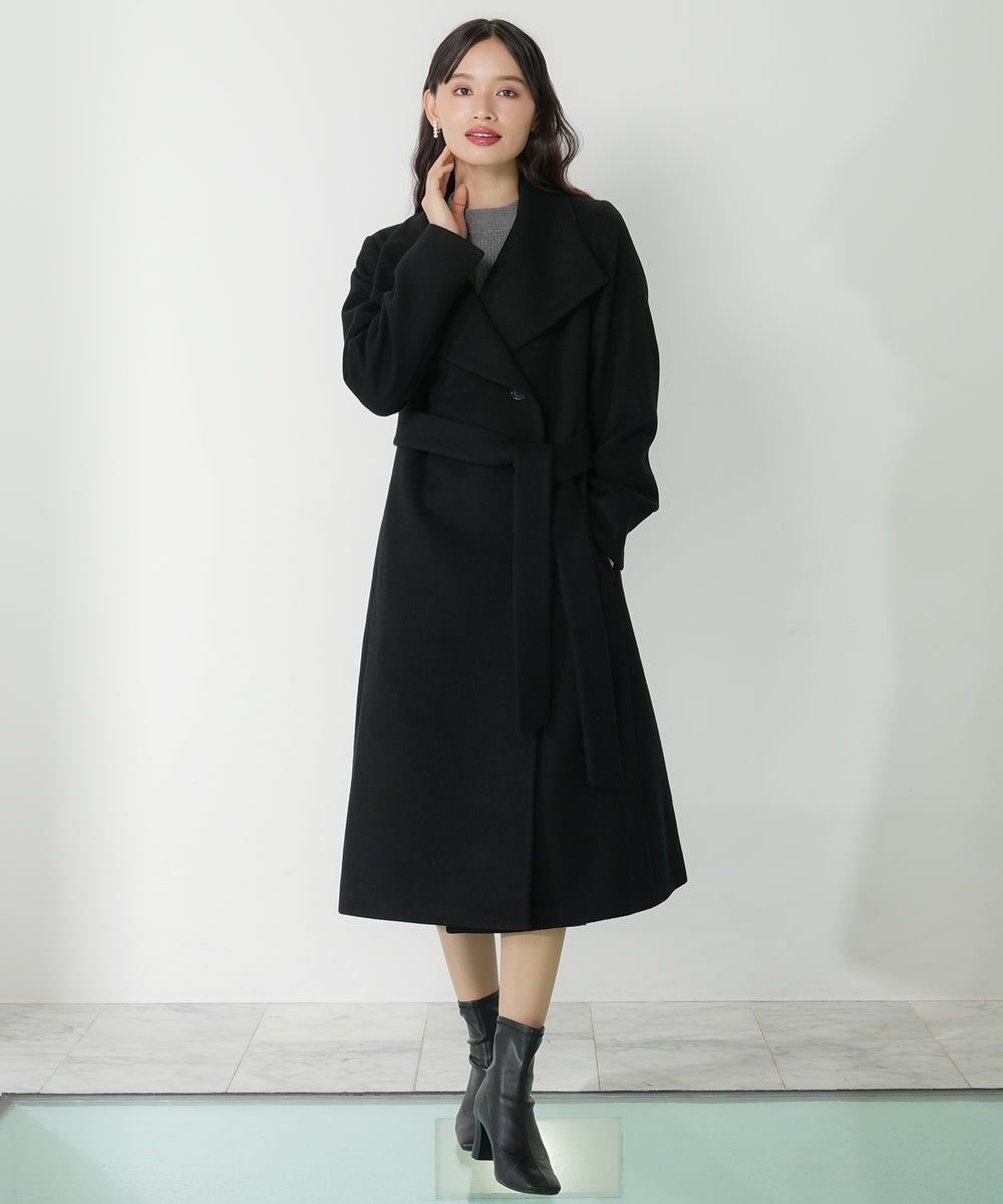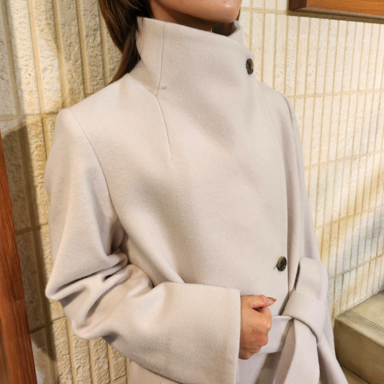 顔周りがスッキリとして見えるショールカラーや、ボタンを上まで留めるとスタンドカラーになる2way仕様なので、その日の気分に合わせてスタイルを変えられるのもポイントです♪