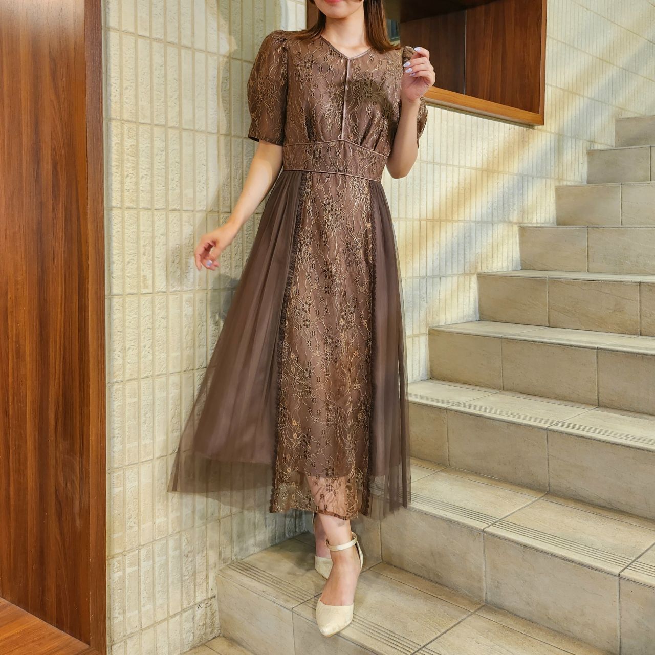 小花柄のレースとチュールプリーツの組み合わせが、エアリーな印象になる1着です♪