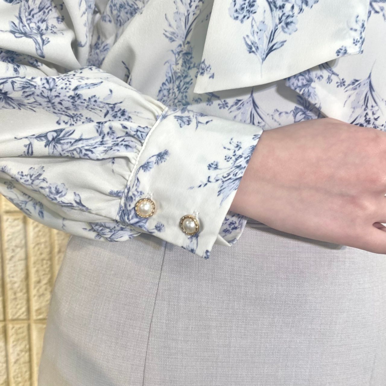 カフスの部分と首元にゴールドの釦があり、