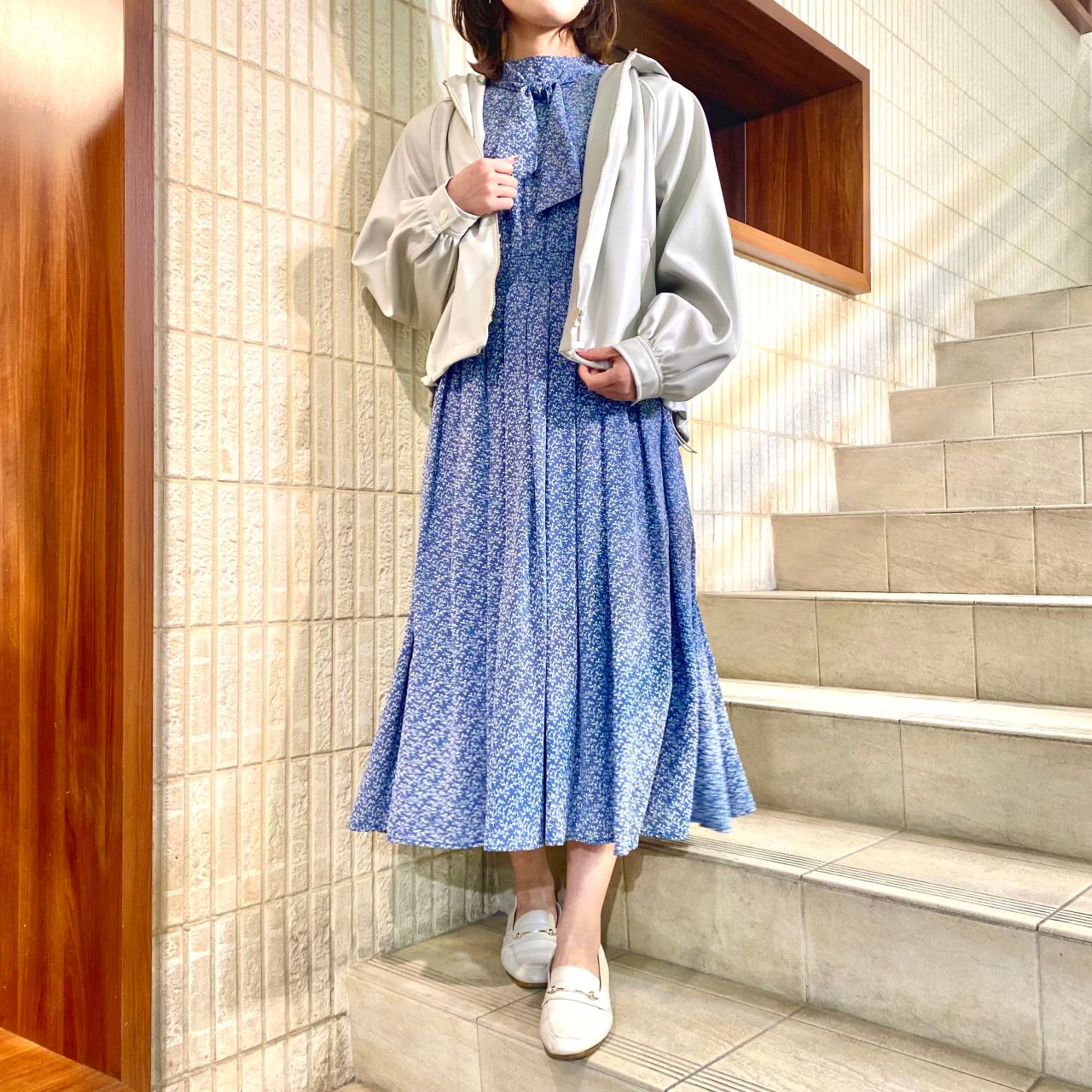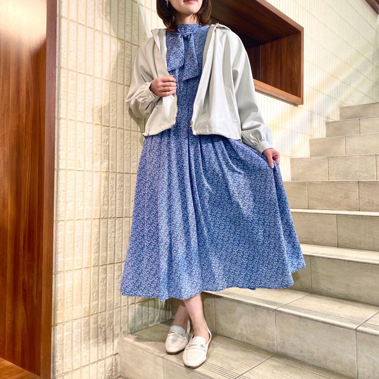 軽いアウターを羽織ることにより春っぽく見え、