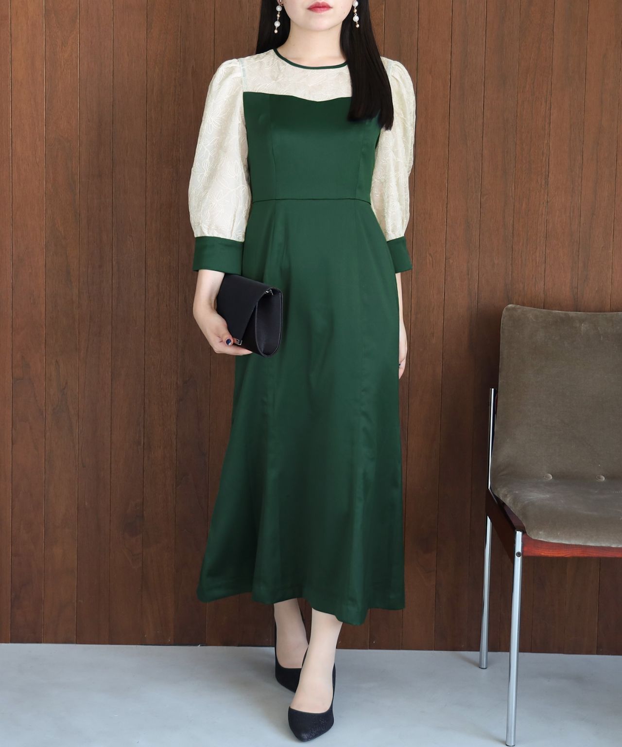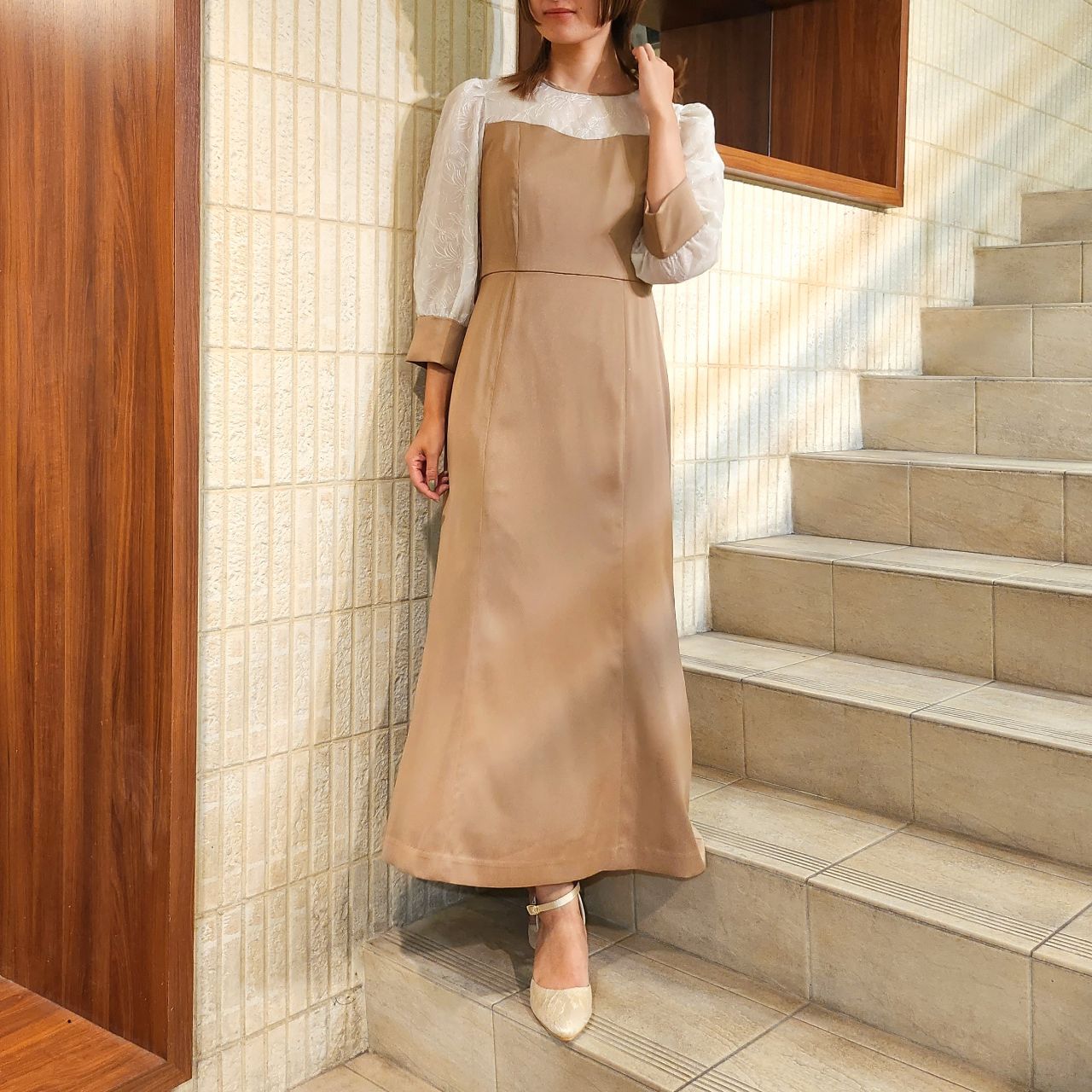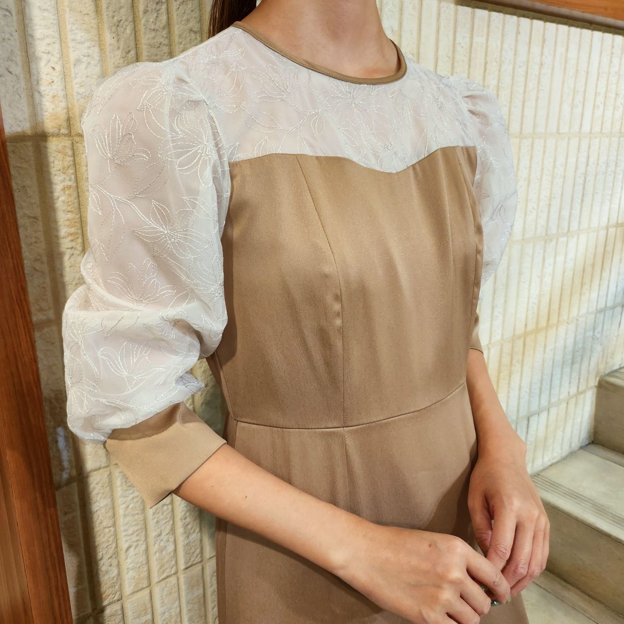 デコルテと袖部分のシアーオーガンジーの花柄ラメ刺繍で華やかな印象になります♪