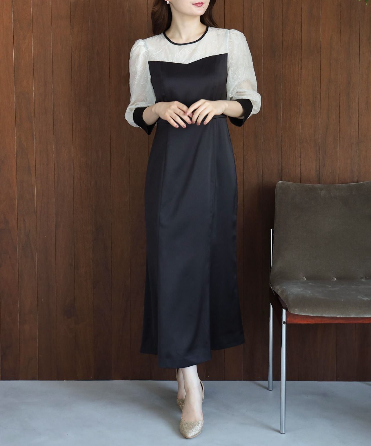 程よいサテンの光沢感とシアーオーガンジーに花柄ラメ刺繍の組み合わせが女性らしいエレガントな一着です♪