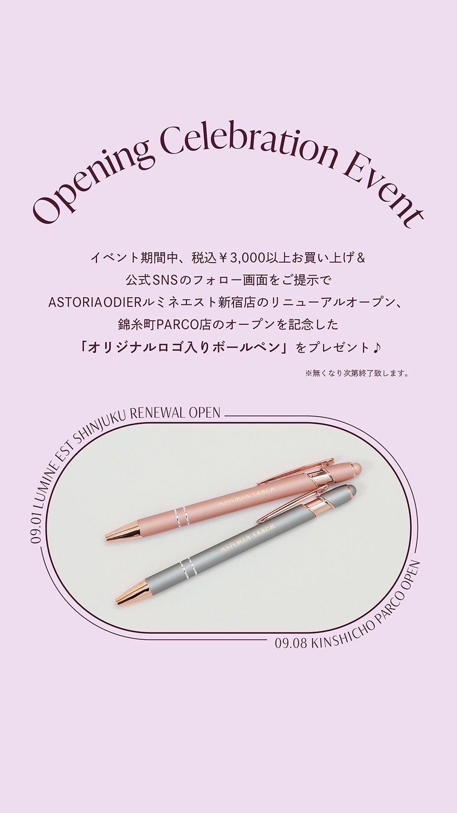 9月1日にASTORIAODIERルミネエスト新宿店リニューアルオープン、9月8日に錦糸町PARCO店のオープンを記念して、税込¥3000以上お買い上げでASTORIAの公式SNSのフォロー、又は画面のご提示で「オリジナルロゴ入りボールペン」をプレゼント致します♪