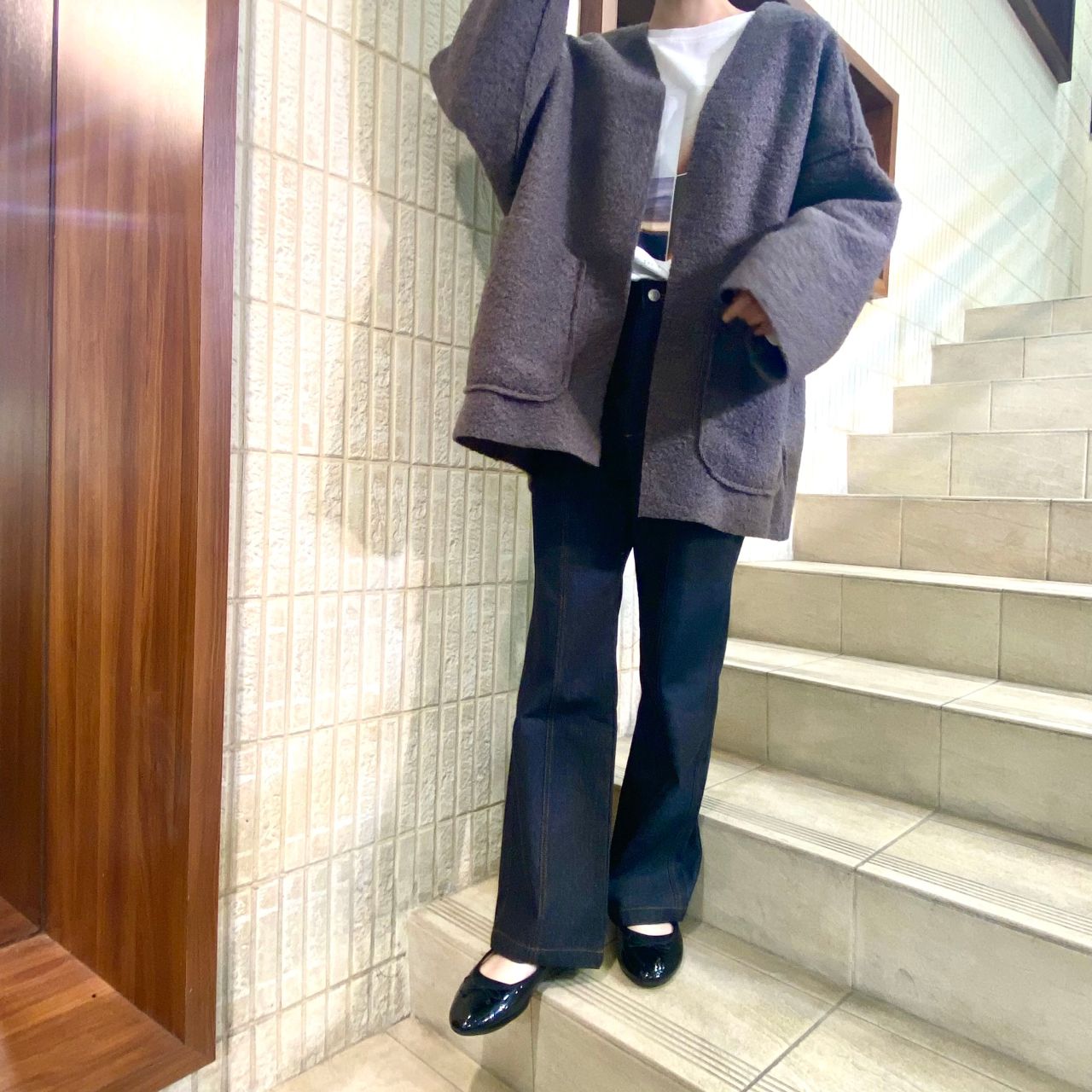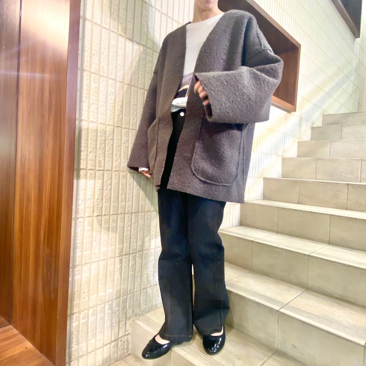 ノーカラーのデザインなので、ハイネックのインナーも合わせやすく、カジュアルな印象になります♪