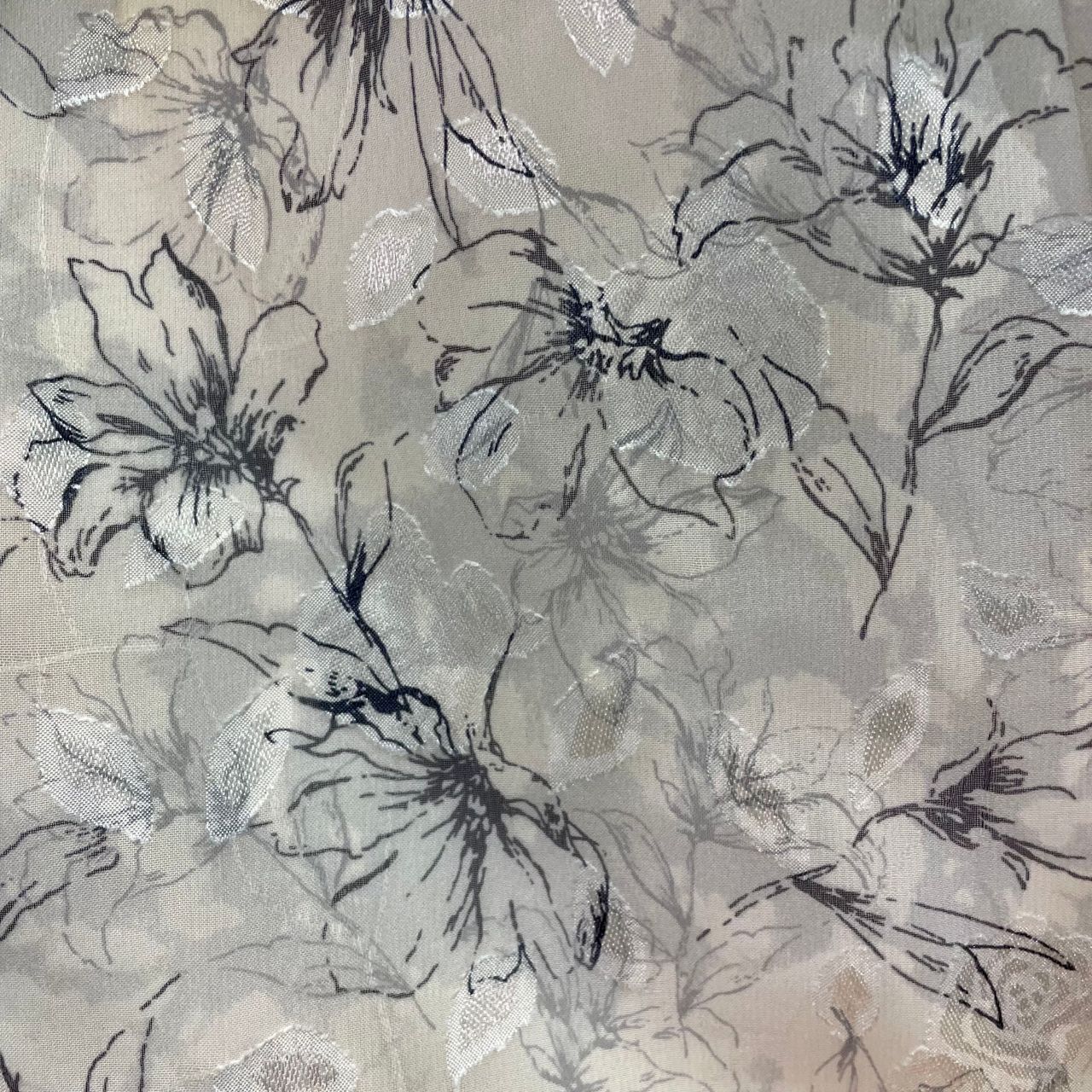 線描きの花柄の繊細さと光沢感のある花弁が散る大人可愛い1枚です。