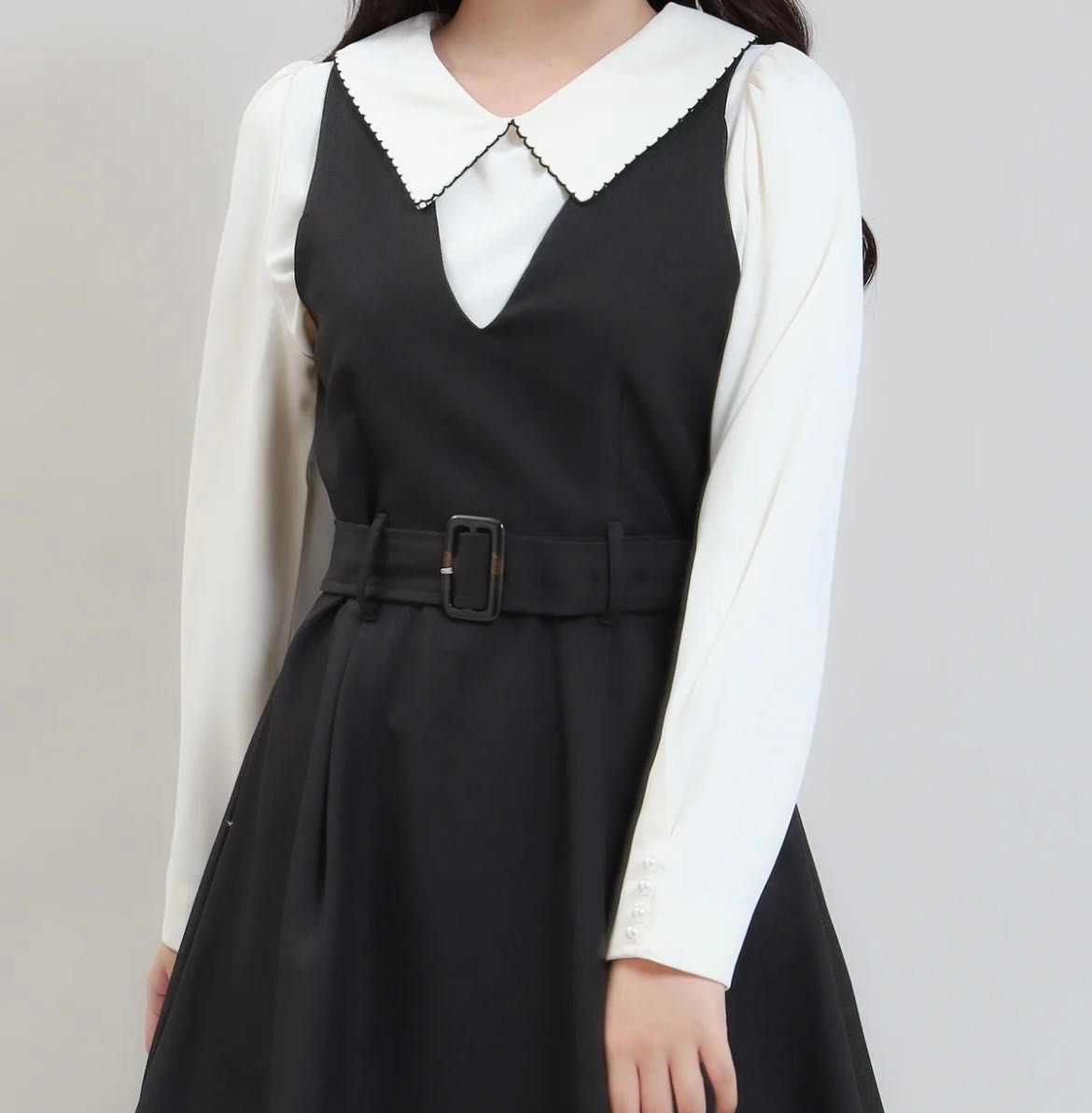 胸元がVネックデザインなので首周りをすっきり見せるデザインでウエストマークのベルトでスタイルアップ効果もあります!