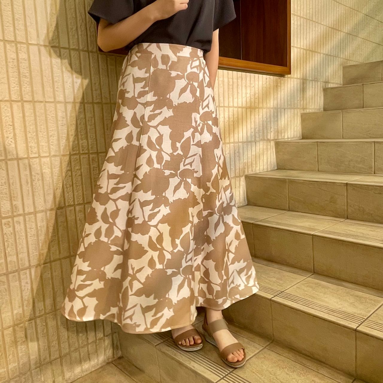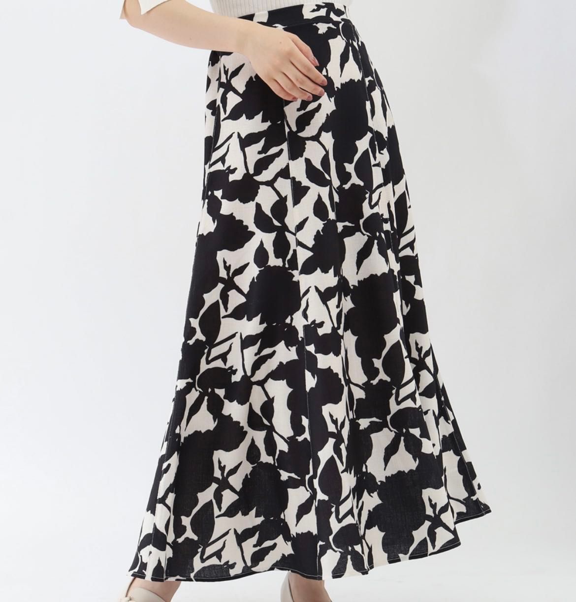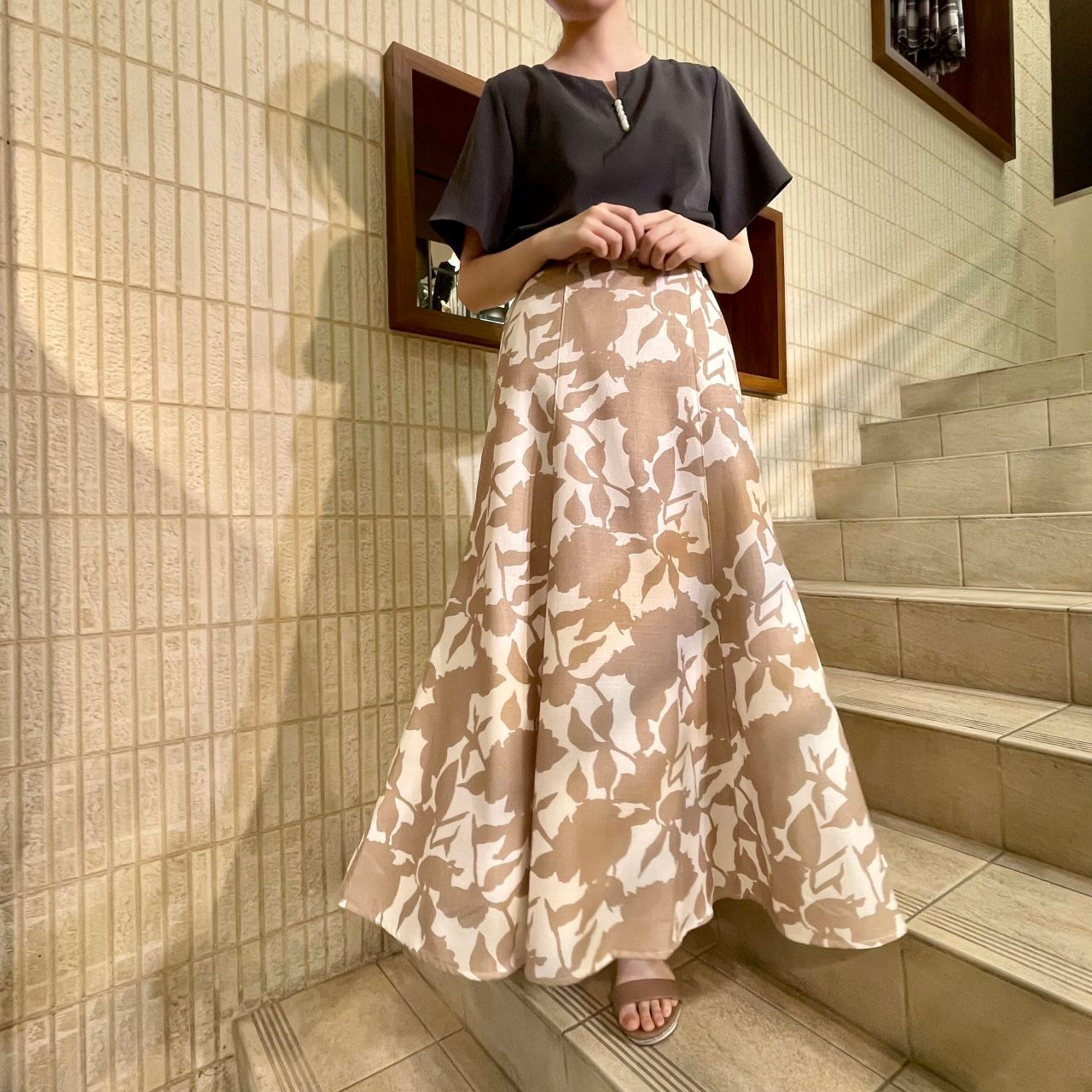 スッキリとしたウエスト周りから裾に向かってふわりと広がるデザインで大きめな花柄は単色使いで程よい上品さを演出してくれます♪