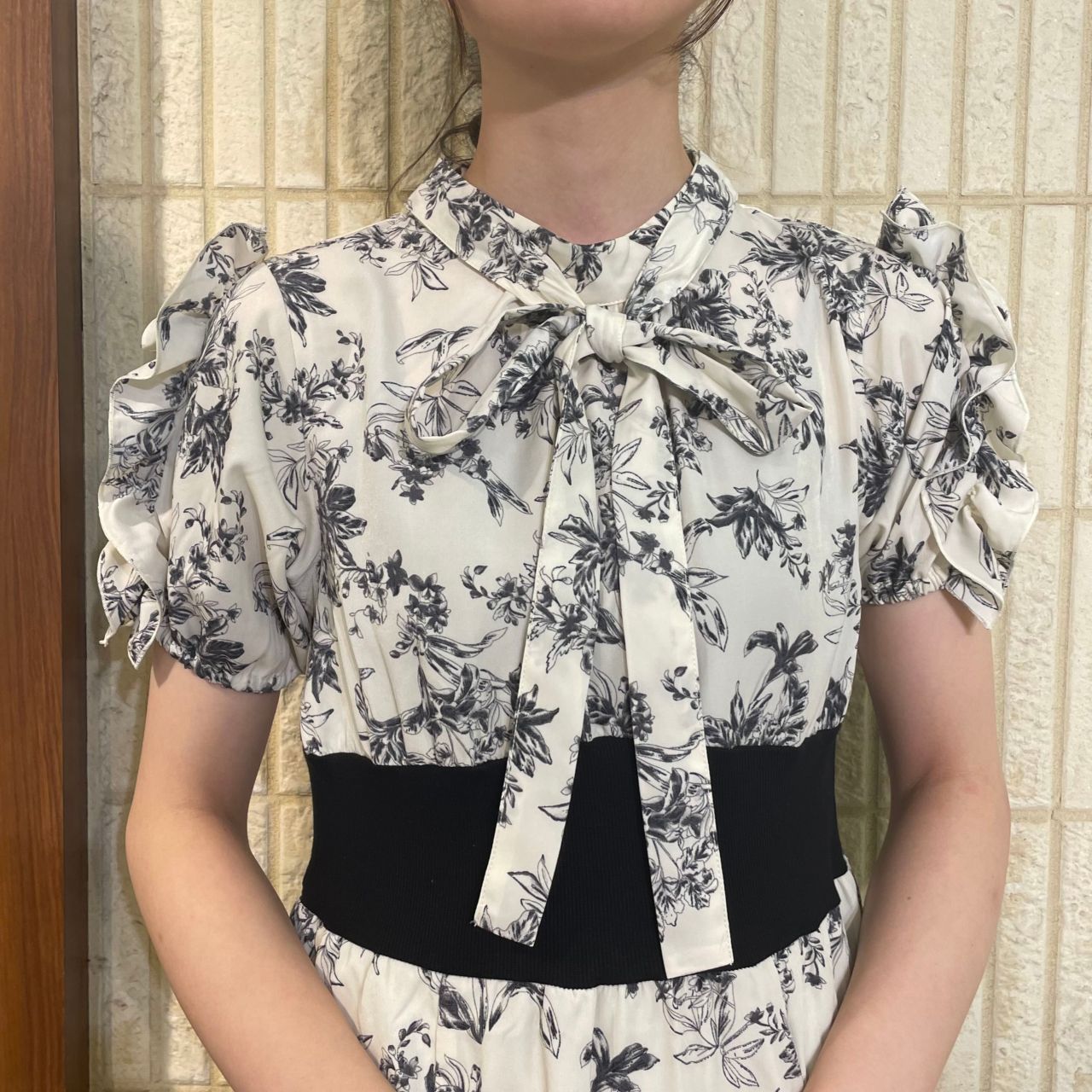 首元を愛らしく見せてくれるリボンタイと、ラインを拾いすぎずストレスフリーに着用できるウエストリブがポイントです✧
