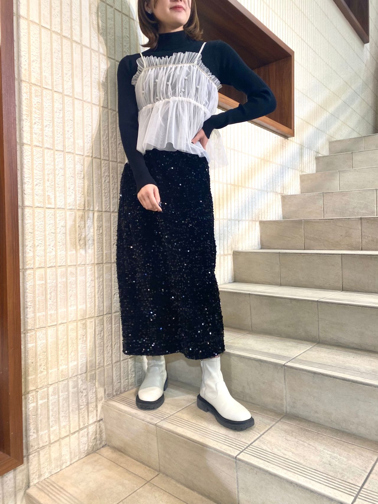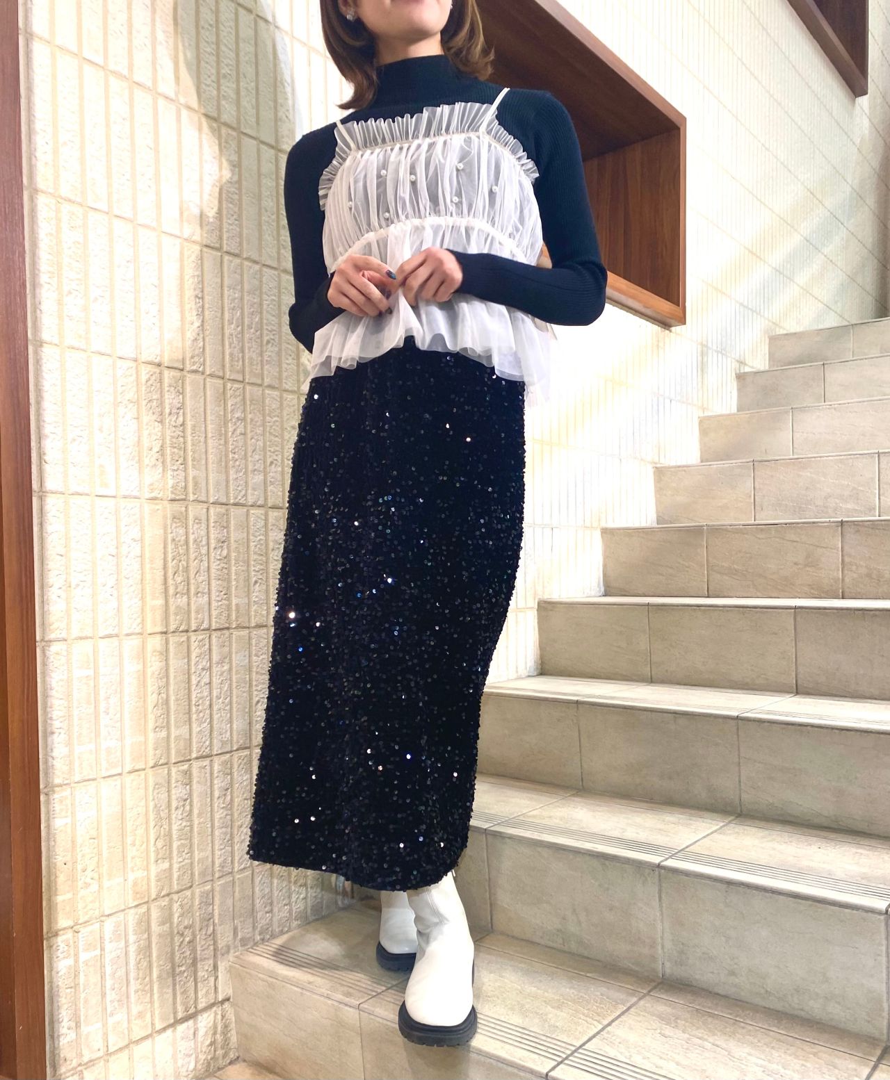 全体的に黒でまとめて、トレンドのチュールのパールビスチェを合わせると
