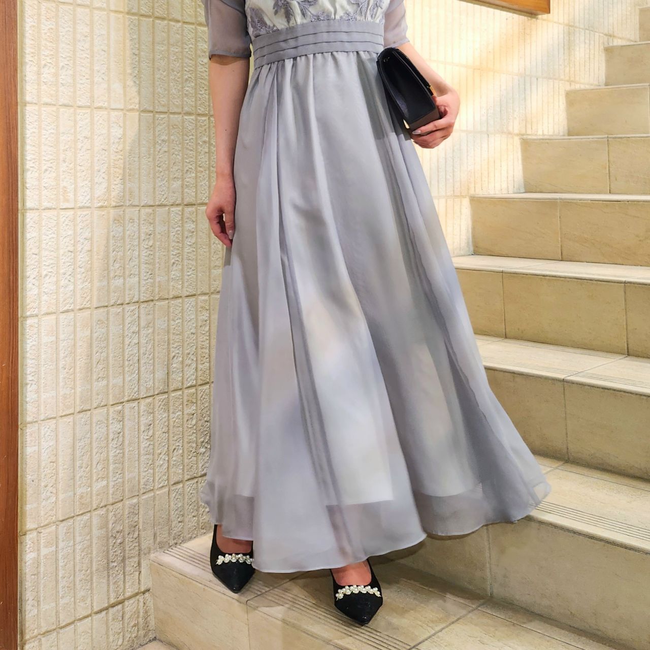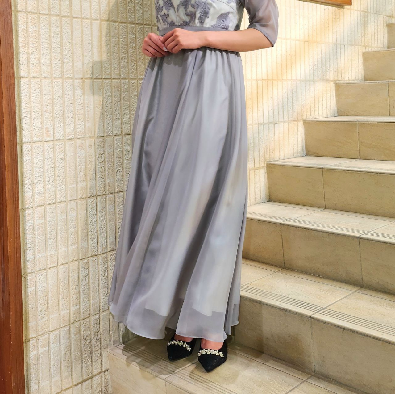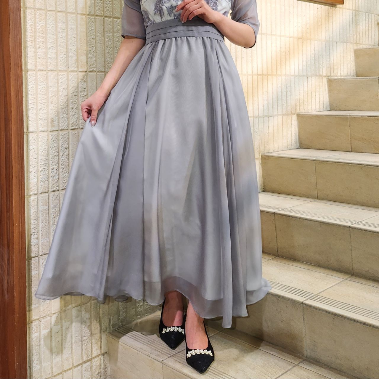 ロング丈で上品で高級感漂うシアーのサテン生地で、動く度に揺れ感が出るので華やかな印象になります♪