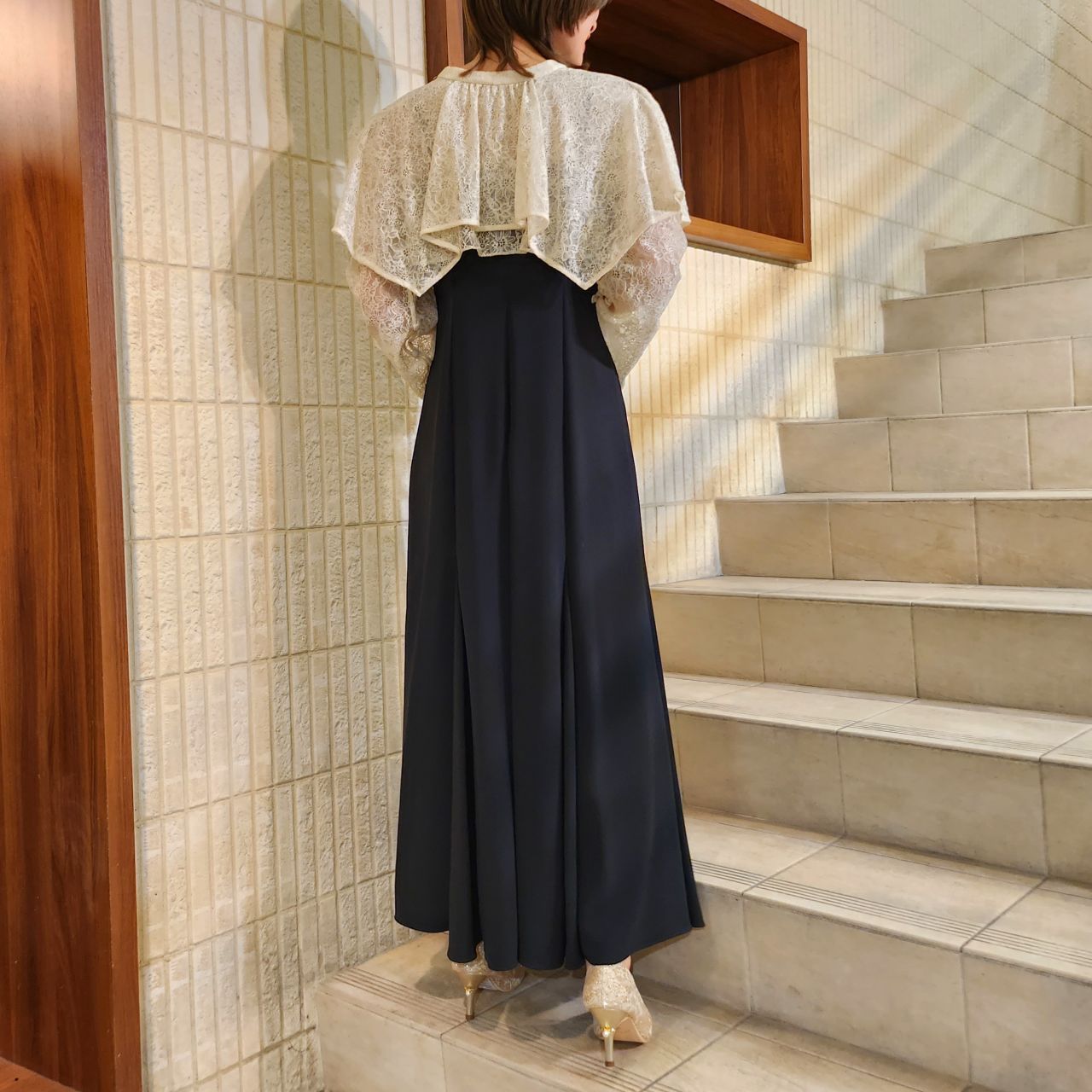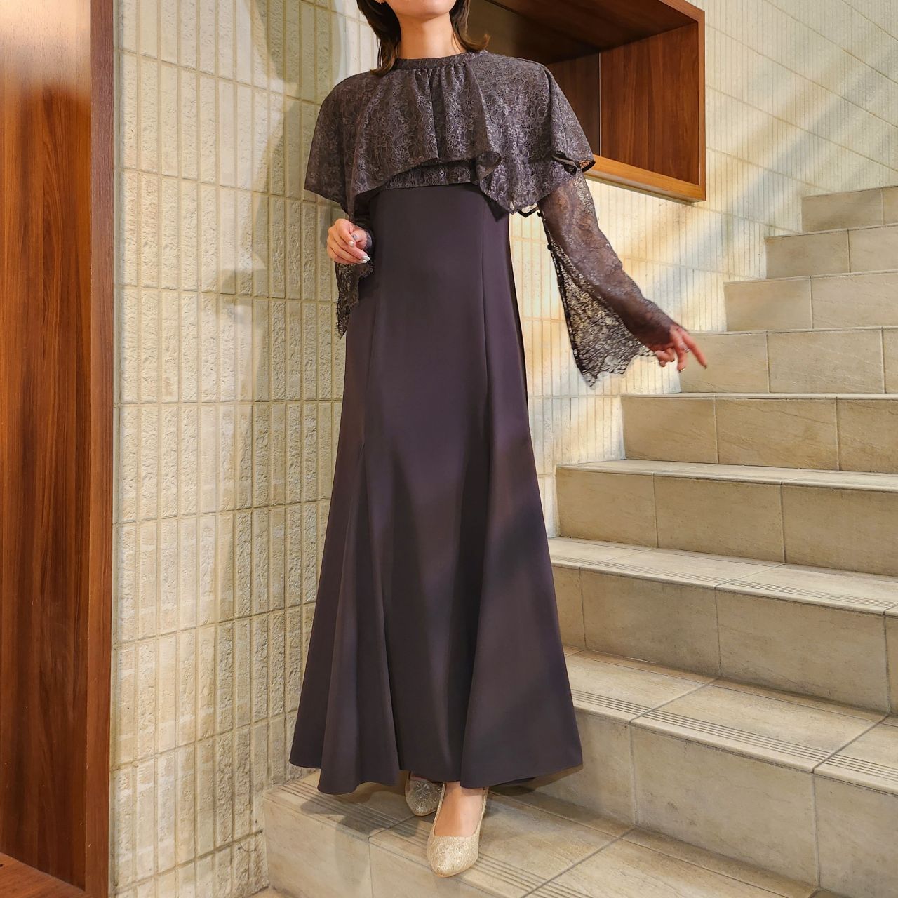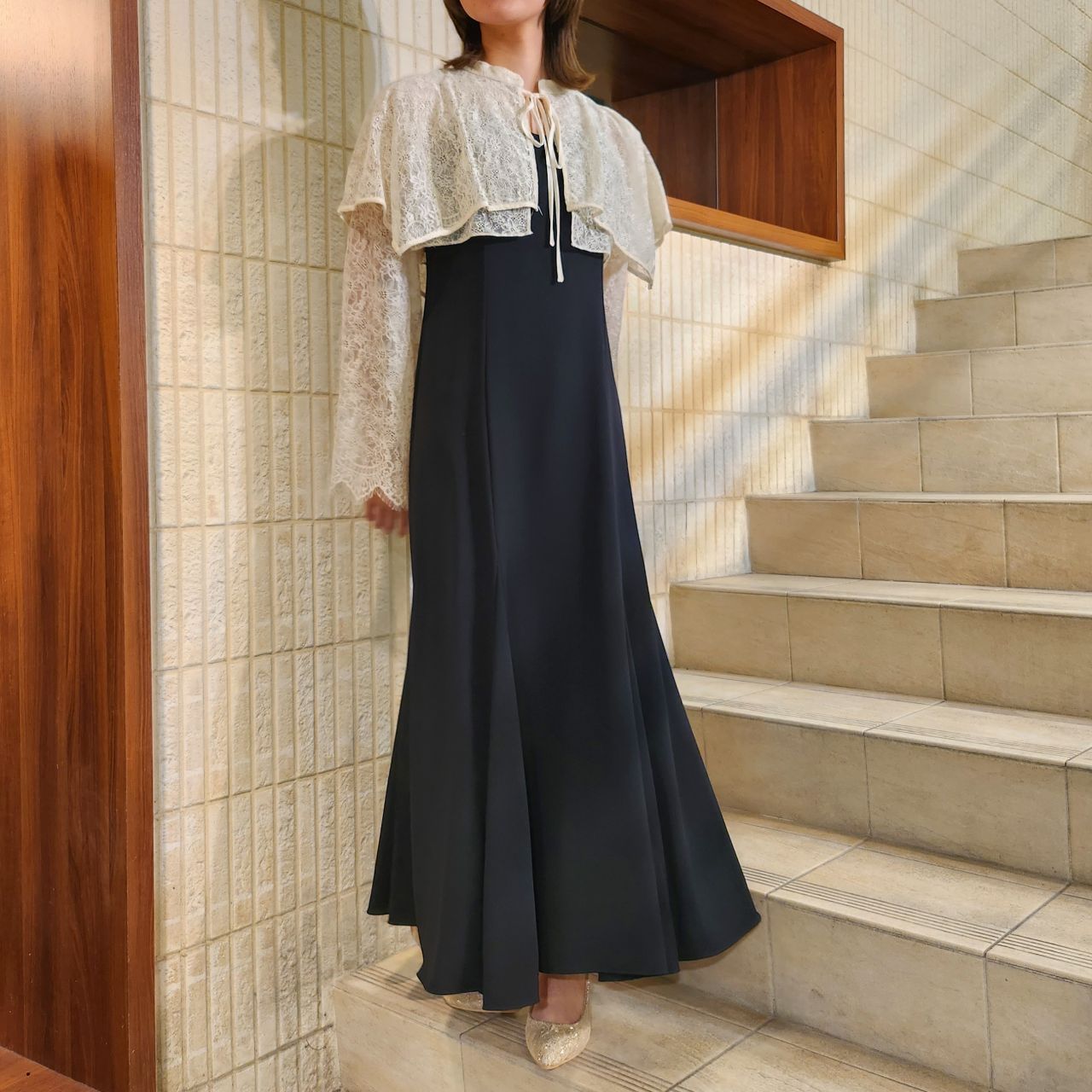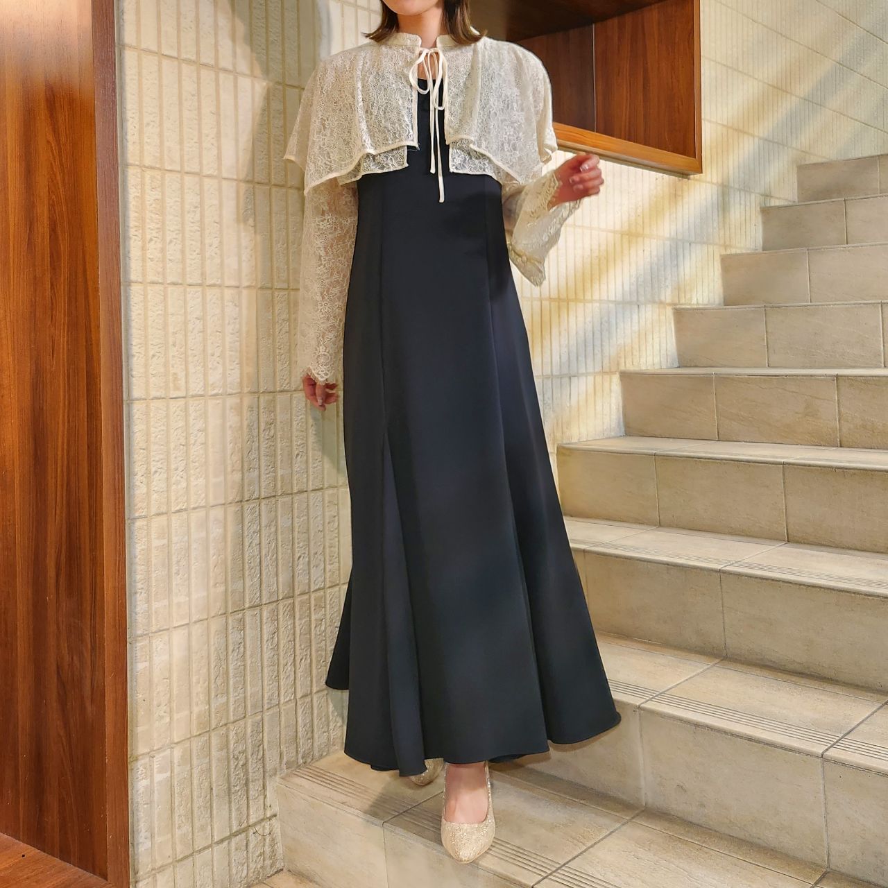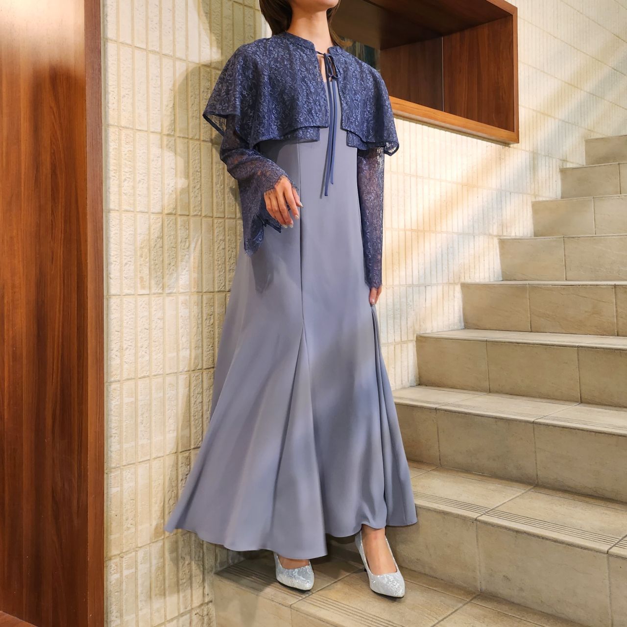 大人気のマーメイドラインのドレスに、最近ではスタンダードになりつつあるボレロドレスもケープタイプにしたことにより、シルエットにヒトクセついたオシャレな雰囲気に♪