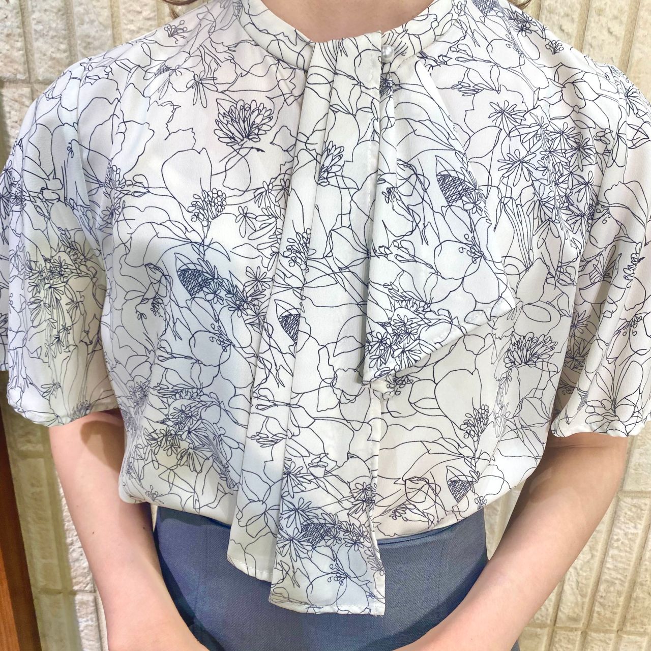 モノトーンの花柄で、さりげなく落ち感のあるボウタイデザインで上品な印象に♪