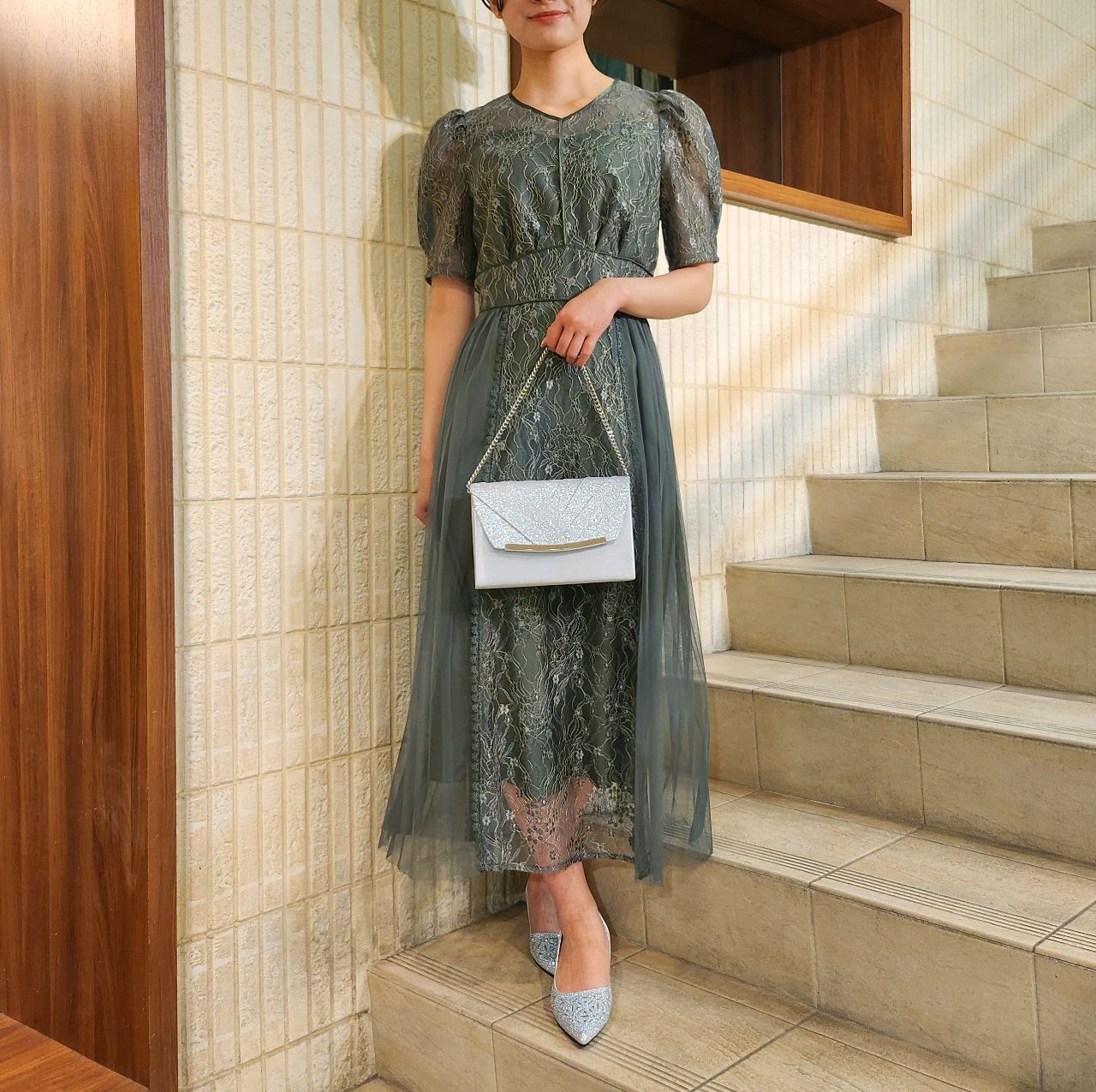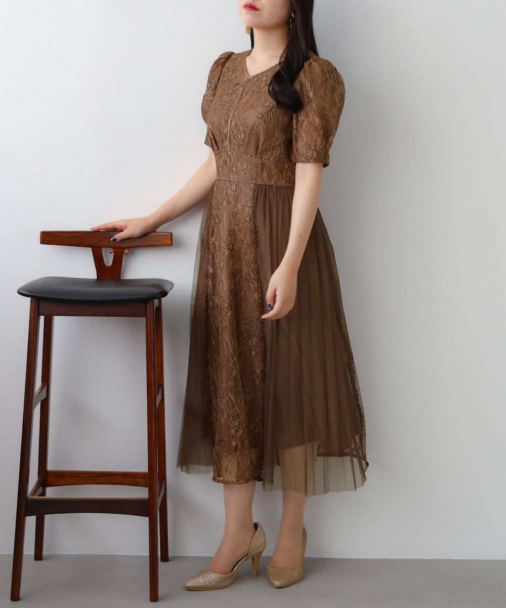 小花を散りばめたラメレース×チュールとアコーディオンプリーツの透け感が印象的なフェミニンドレスです♪