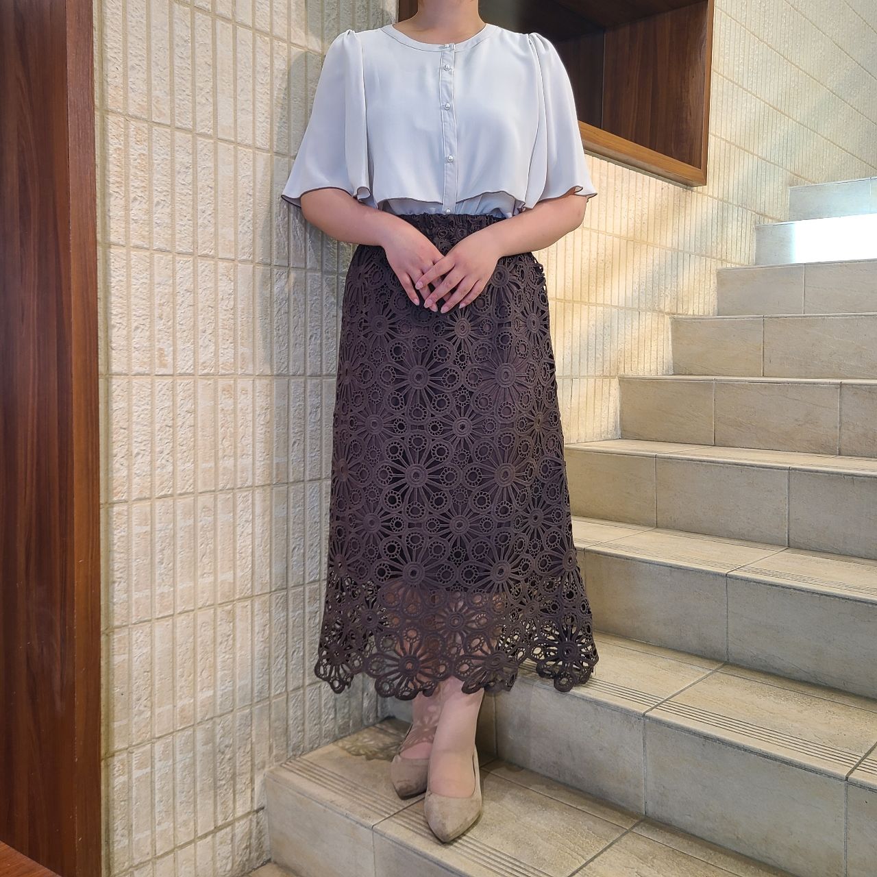 配色のパイピングとパールボタンがポイントのブラウスを使った、大人のお出かけフェミニンコーデです♪