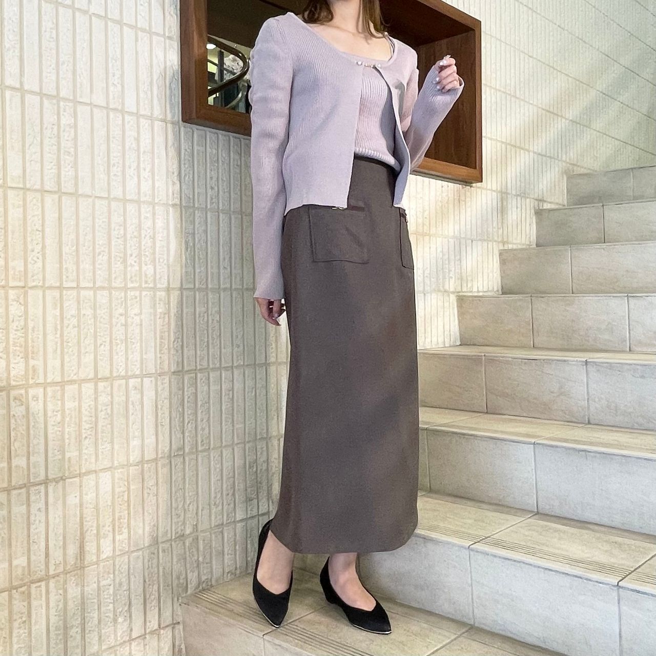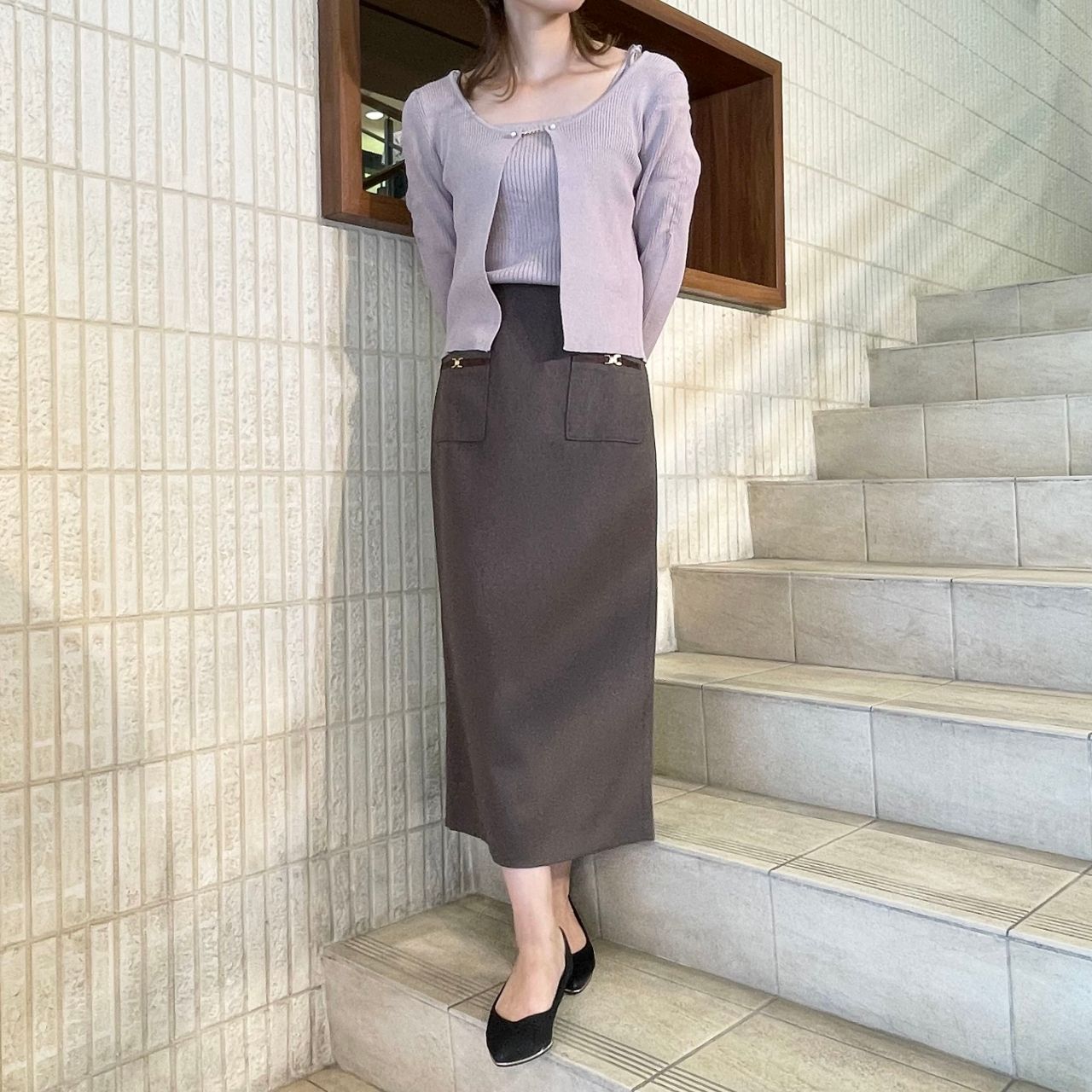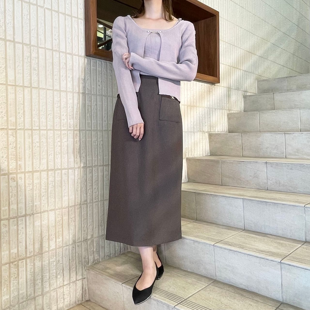 タイトなシルエットと首元のパールが女性らしさを演出。