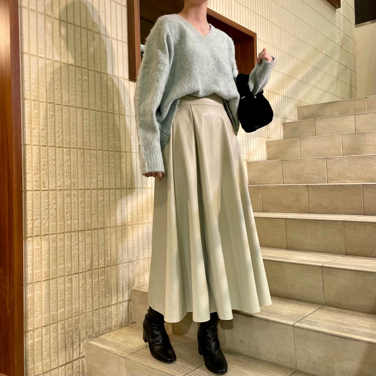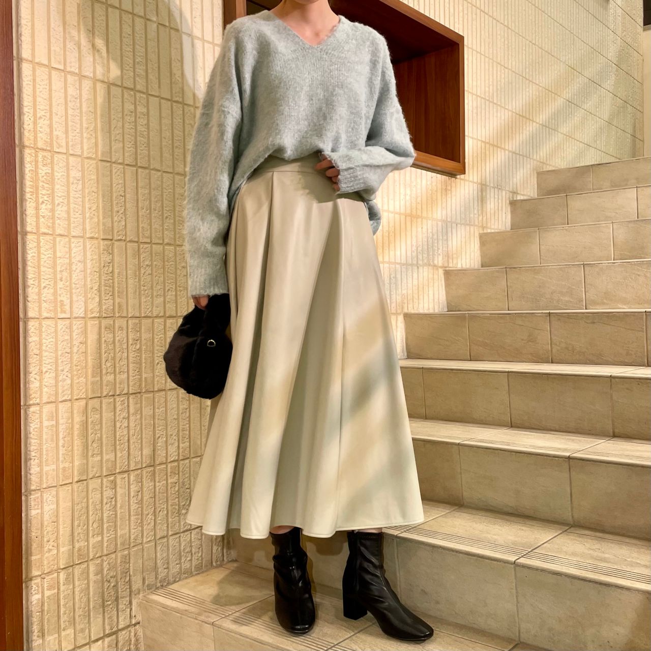 ニットの淡いカラーに合わせてホワイトのレザースカート&ブーツで更にトレンド感を出しつつ、飾り過ぎないカジュアルコーデです♡