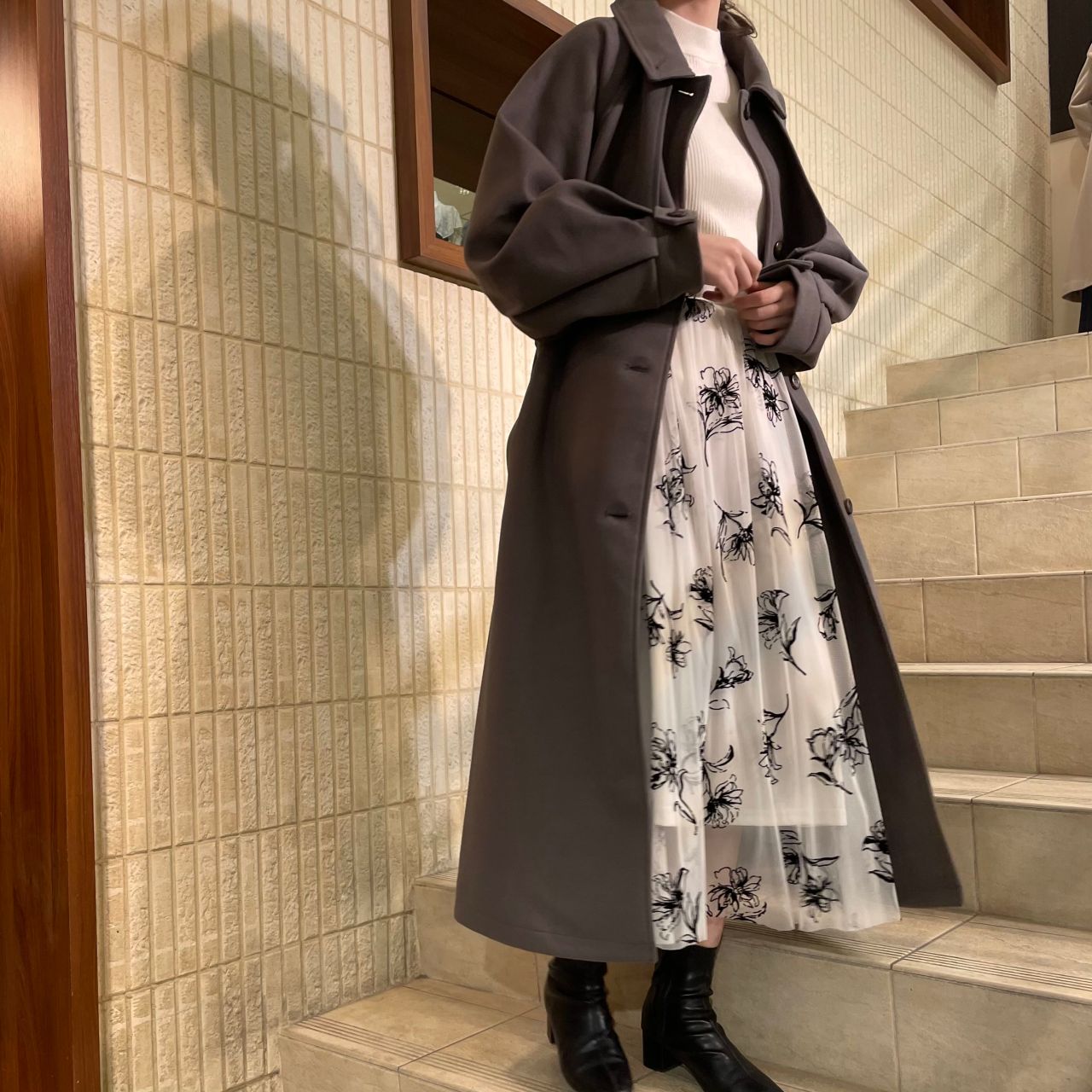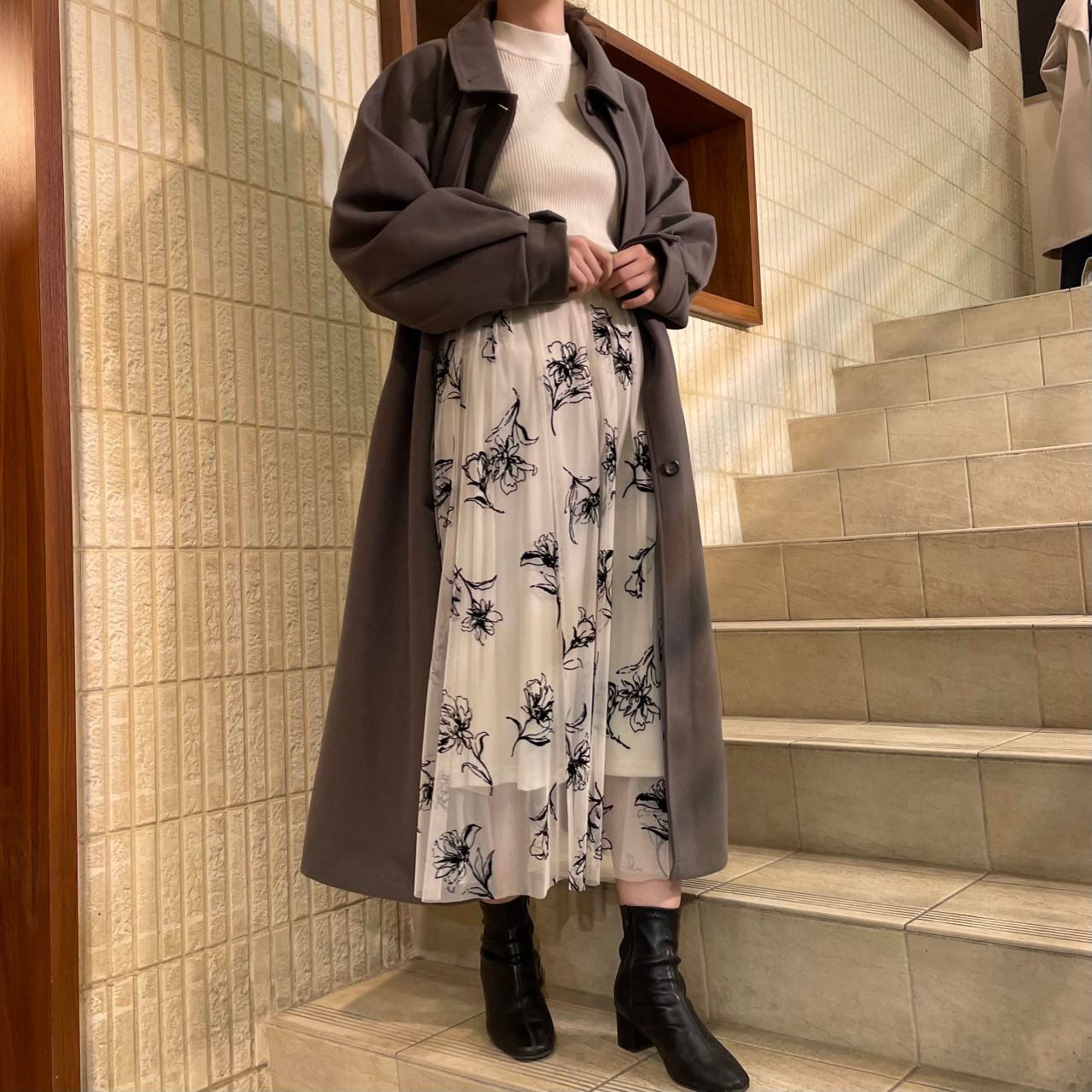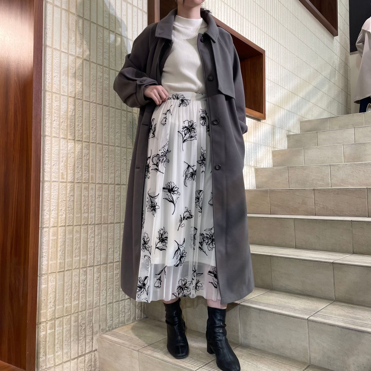 コートで冷たい風を防ぎつつ、チュールスカートの揺れ感とトップスをベージュで統一する事で重くならない春先コーデにしました✧