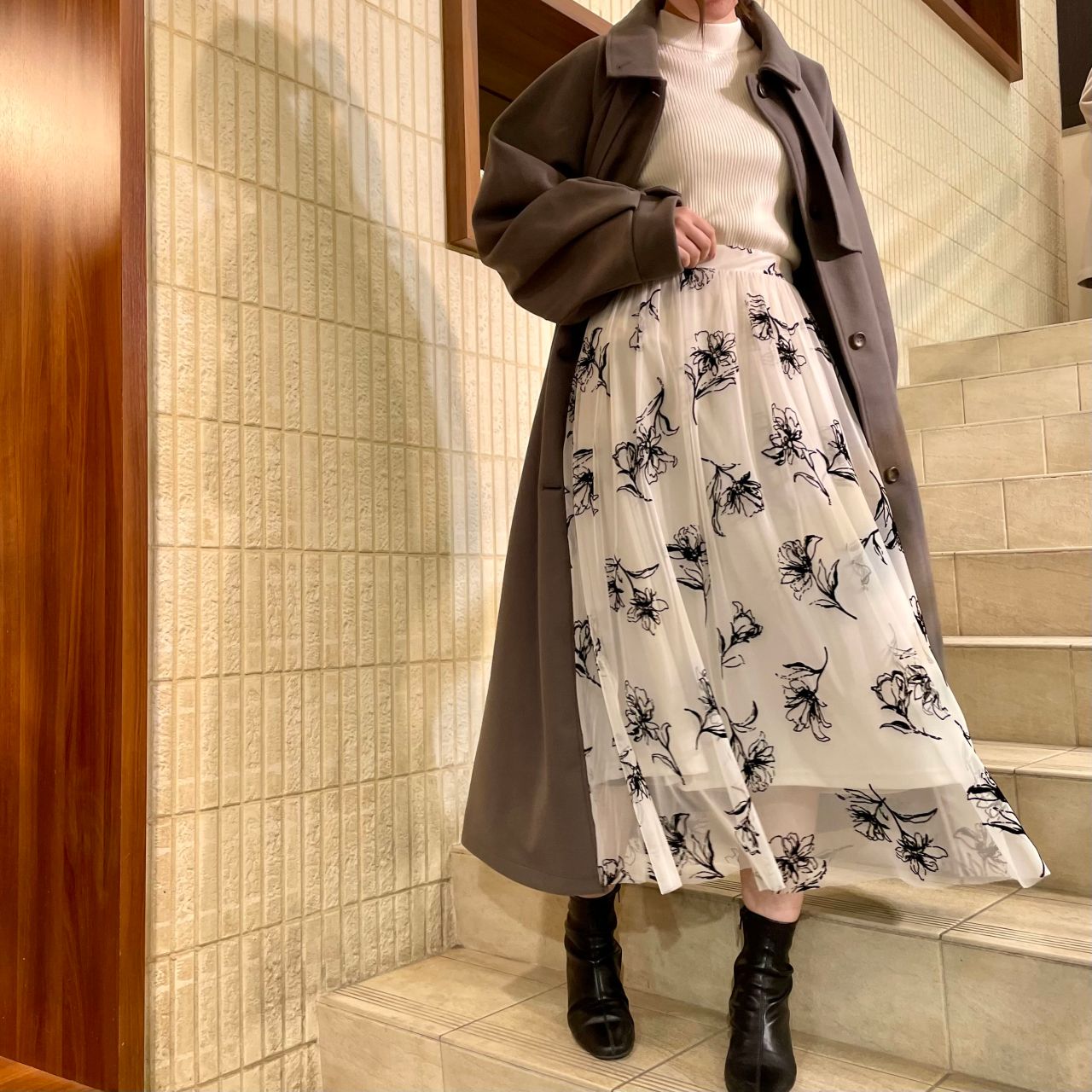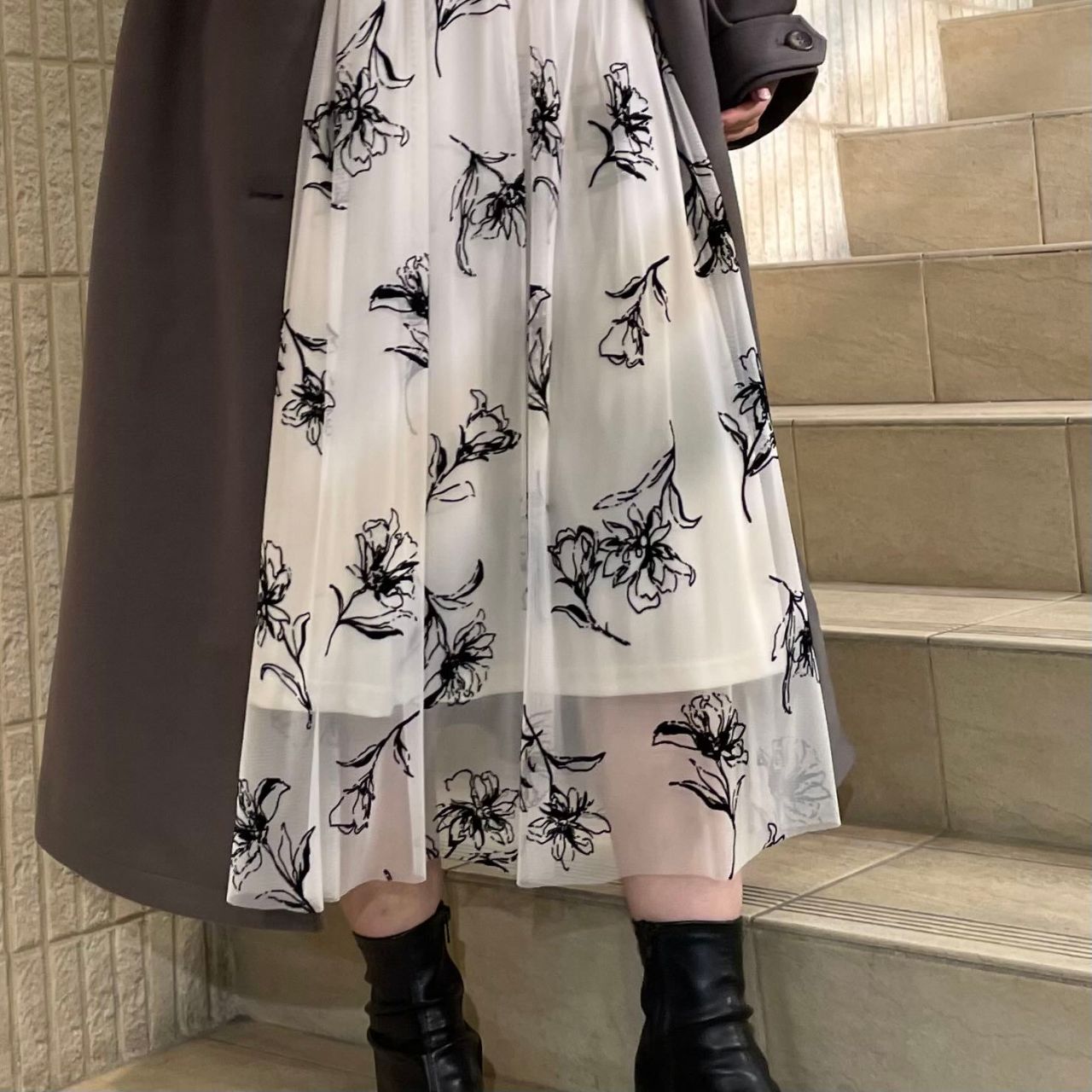 今回のチュールスカートは脛から足元にかけて透け感があるスカートなので肌見せにも繋がり足元まで華やかなデザインとなっております♪
