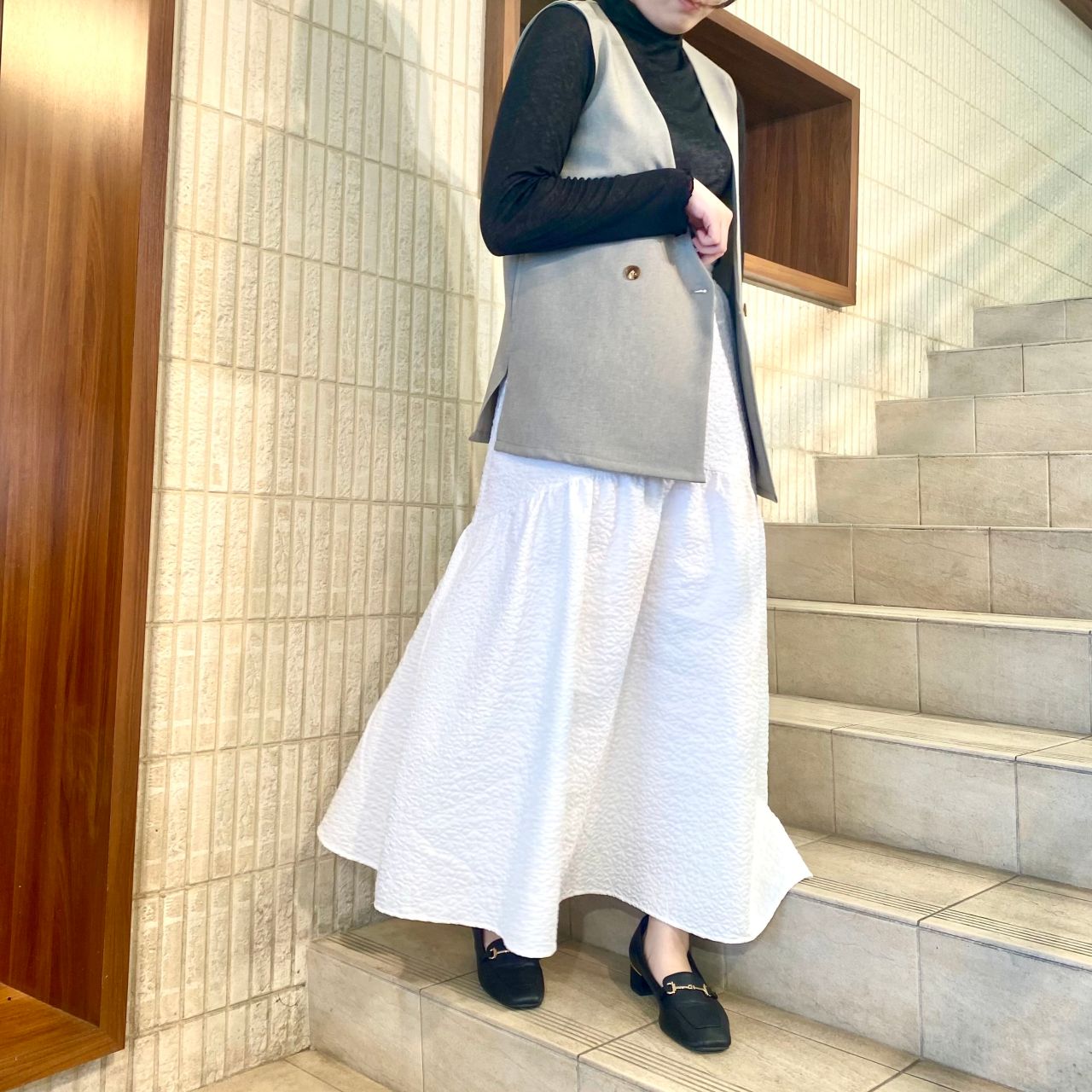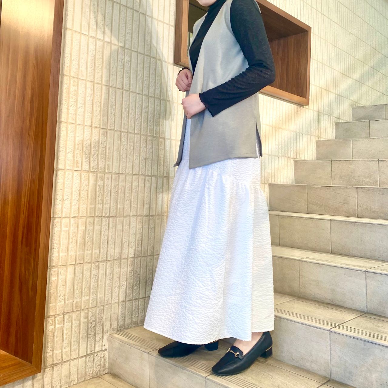 ベストを合わせるとカジュアルな雰囲気で、インナーの色を変えるだけで違う印象になります!