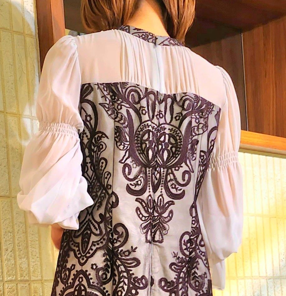 ダマスク柄の刺繍レースが印象的でクラシカルなドレスです