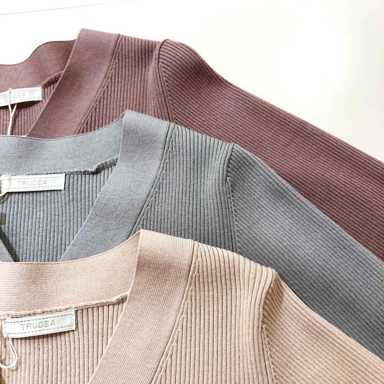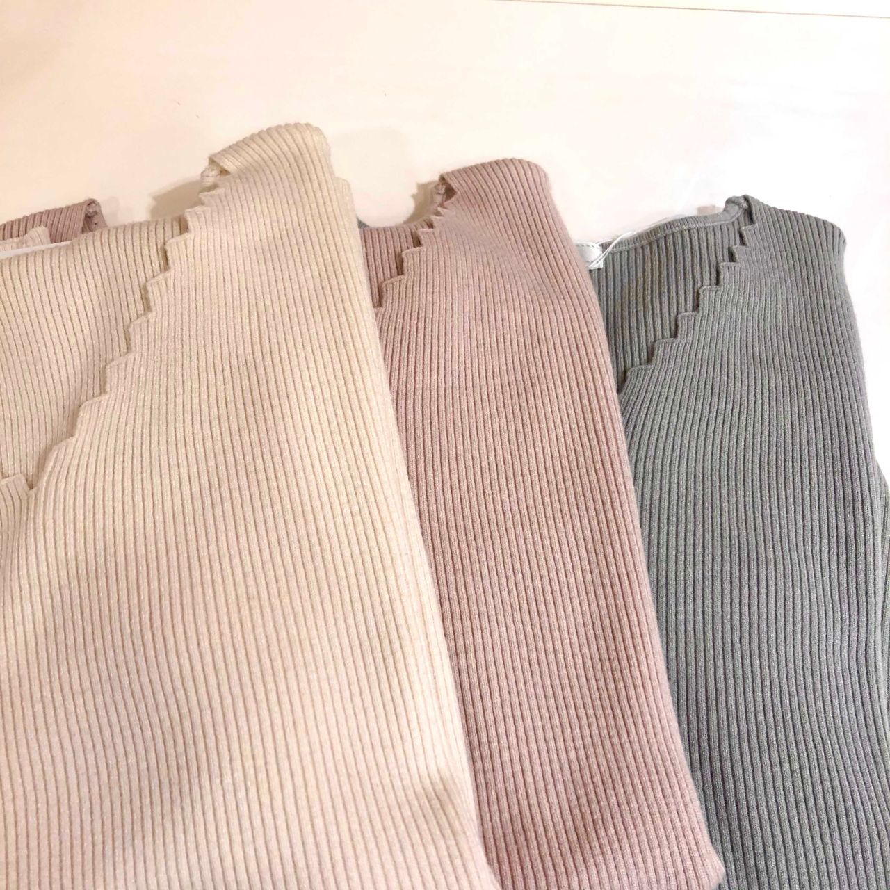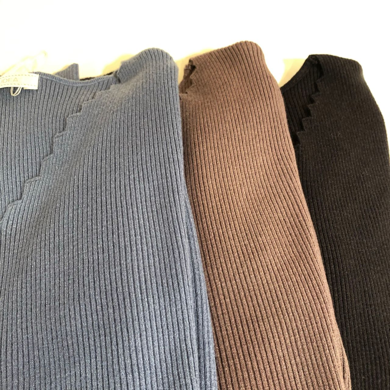 リブ編みでほどよいフィット感が出るので、ロングスカートやワイドパンツなどを合わせるとキレイですよ♫