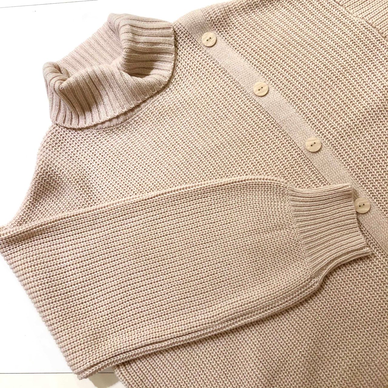 ぴったりしすぎないタートルは小顔効果も抜群で、縦に入ったボタン使いが着こなしのワンポイントになります!