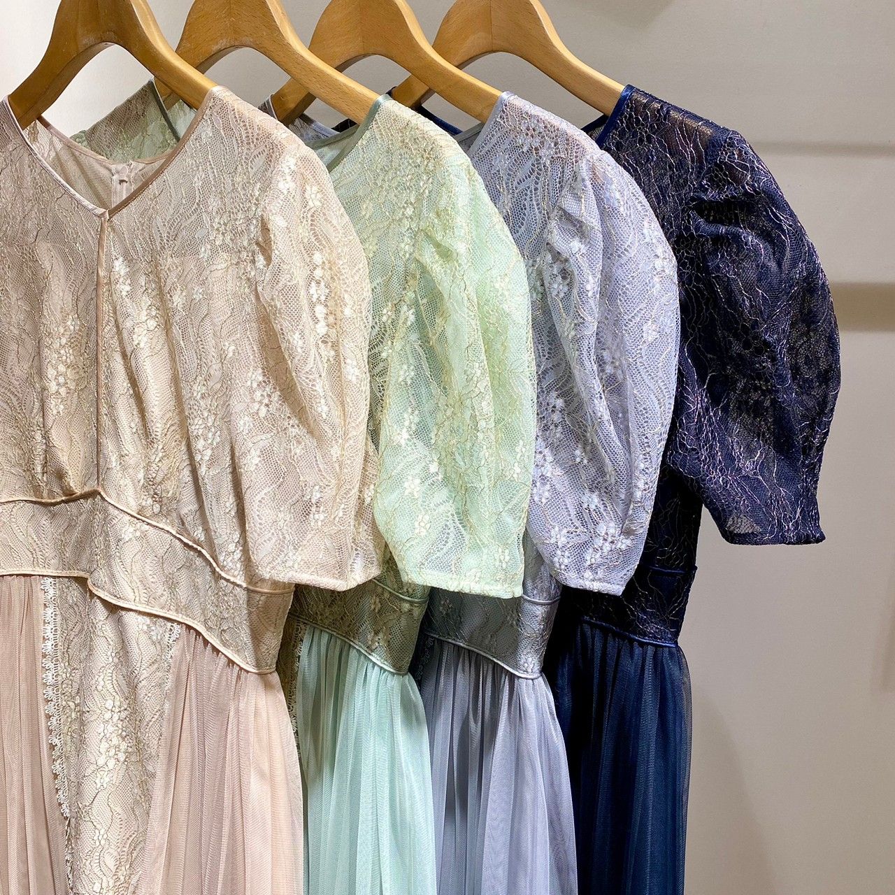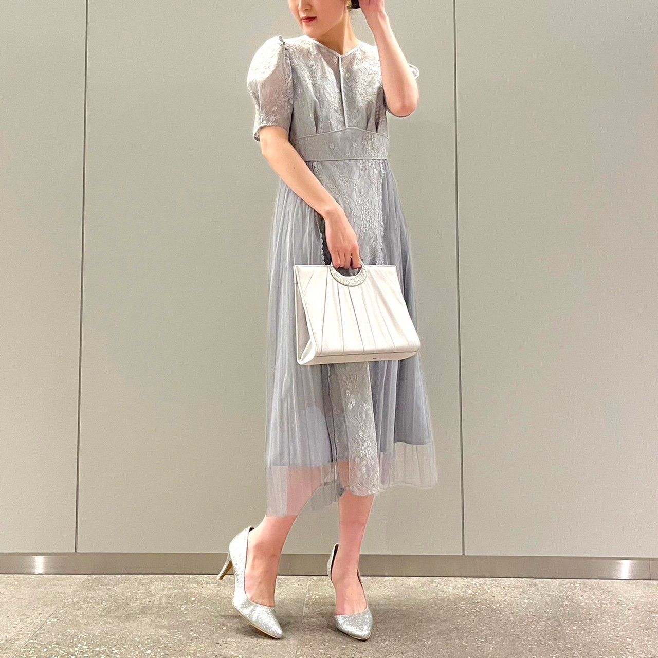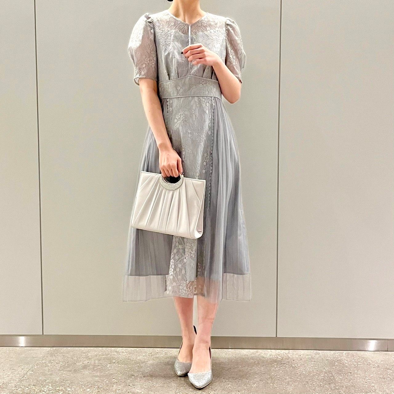 小花を散りばめたようなレースとチュールプリーツの透け感がエアリーな印象のデザインドレス!