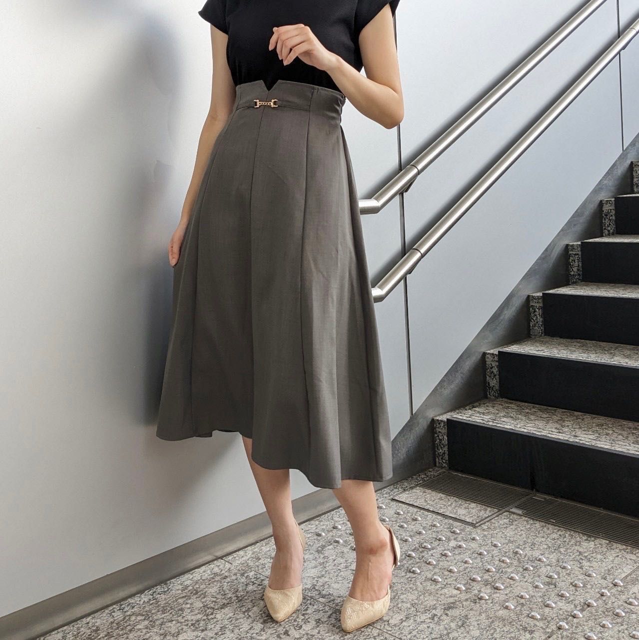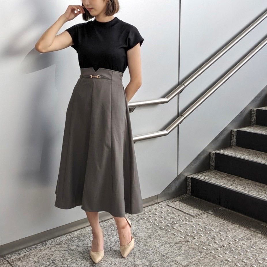 膝を隠してくれる上品な丈感でさりげなく旬な大人レディを演出♪