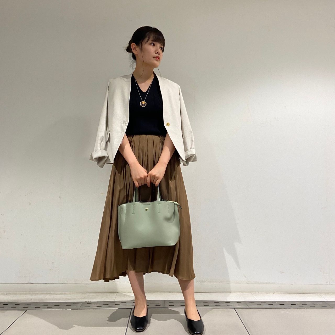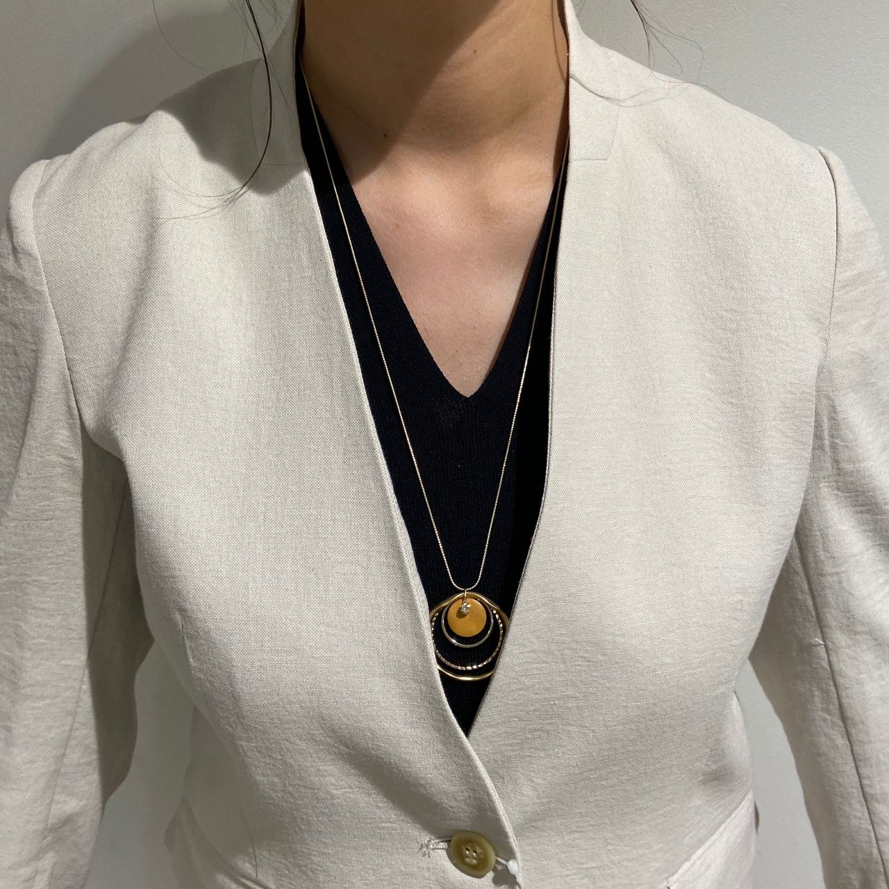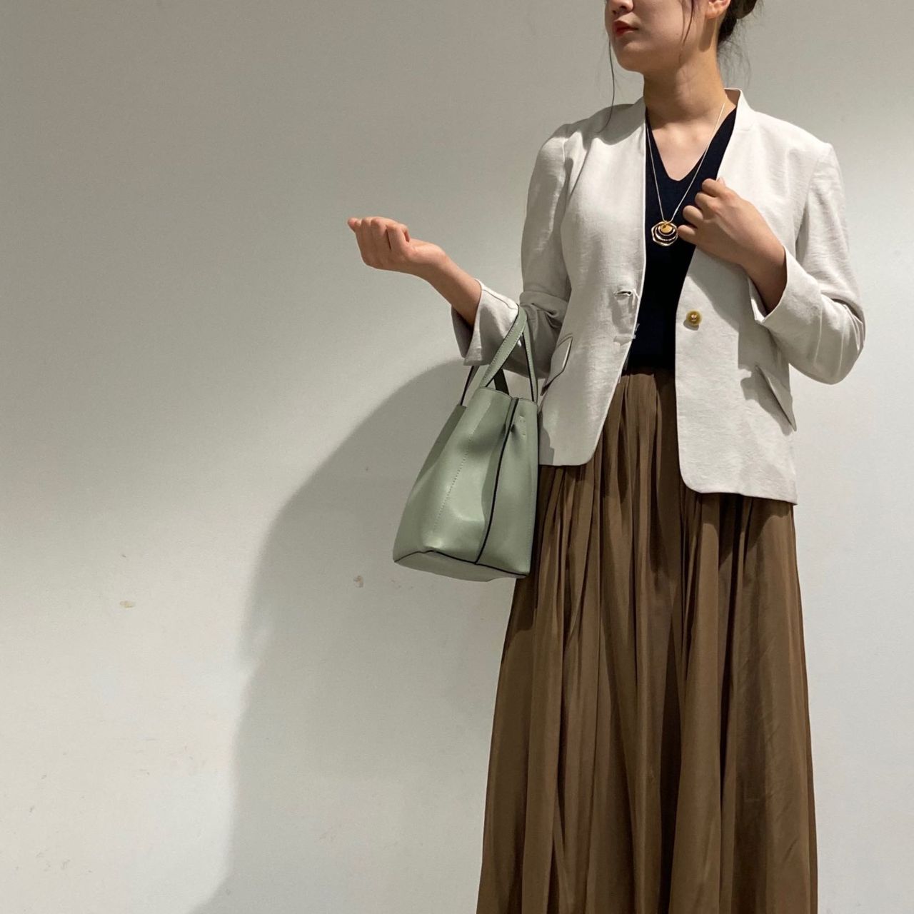 襟元がノーカラーなので首周りをスッキリ見せてくれます!
