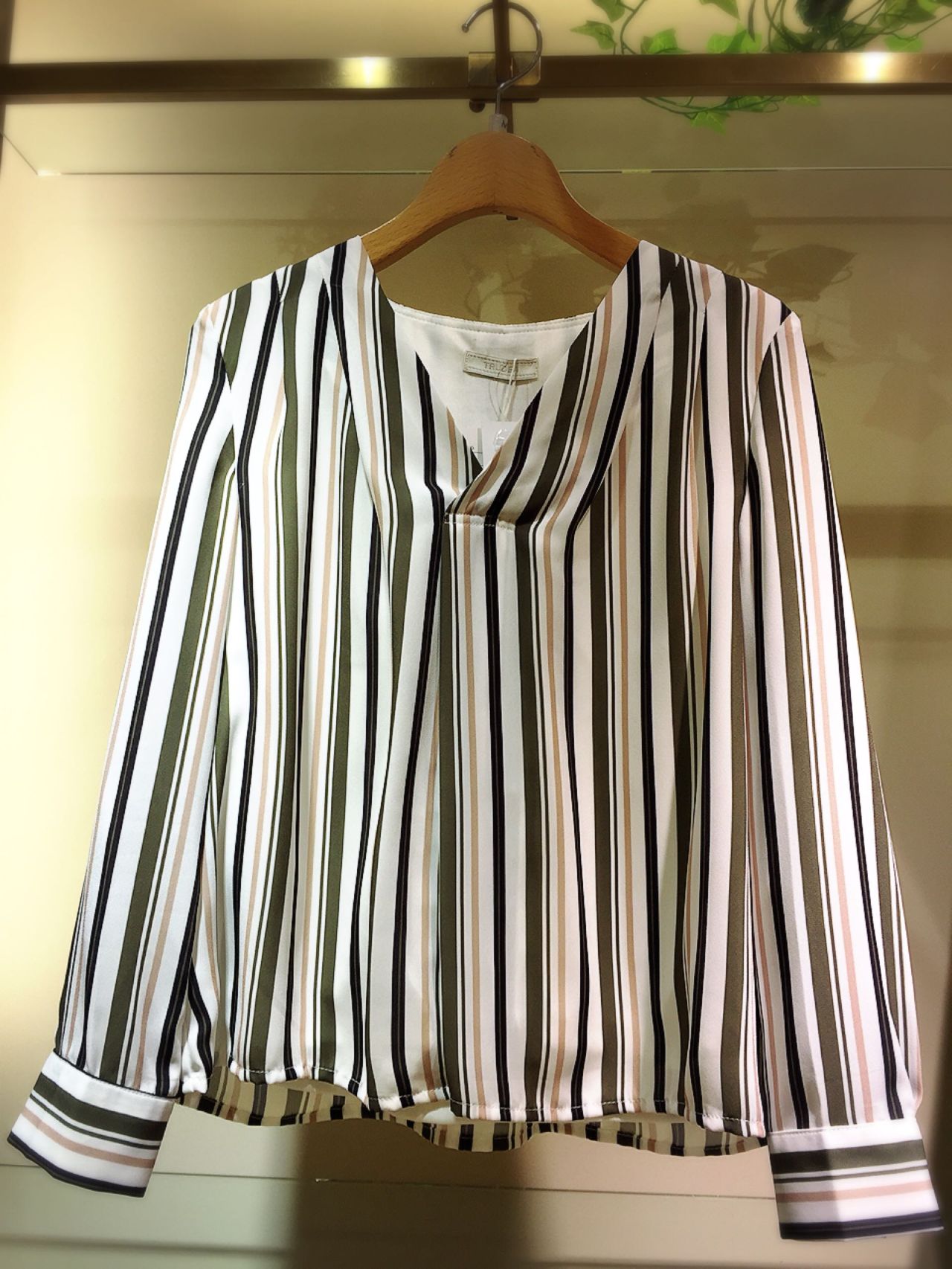 テロンとした素材のストライプブラウスは、キリッとしたイメージと女性らしい上品さを合わせ持った優れものです!