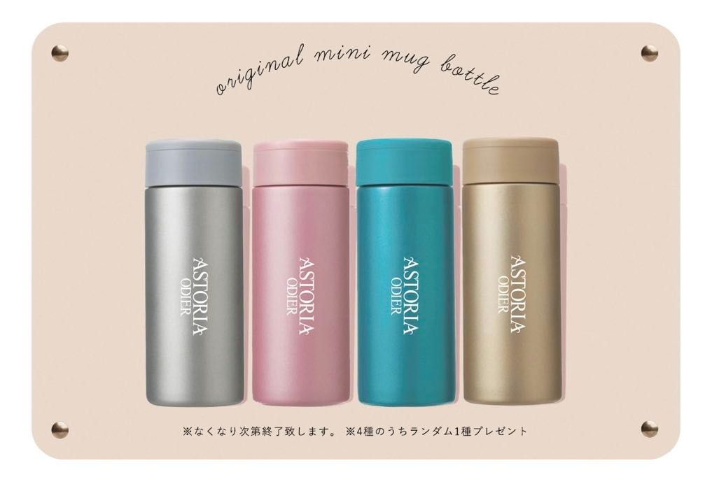 只今アストリアオンラインショップにて税込10,000円以上購入して頂いた方にノベルティとしてアストリアオリジナルのロゴ入りミニボトルをプレゼントしております☺︎