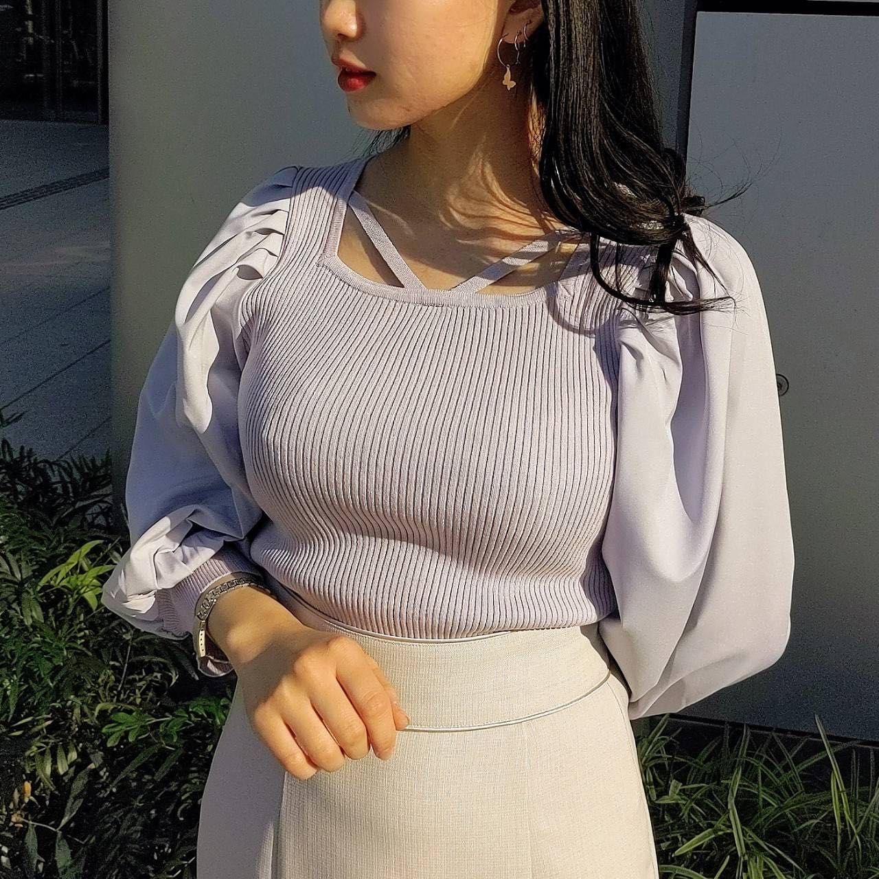 ○袖異素材クロスデザインニット