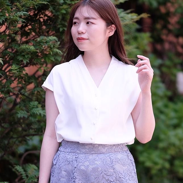オフィススタイルでも使える万能なパールボタンブラウスをご紹介します☺︎