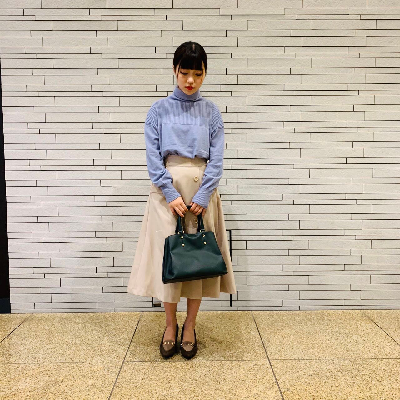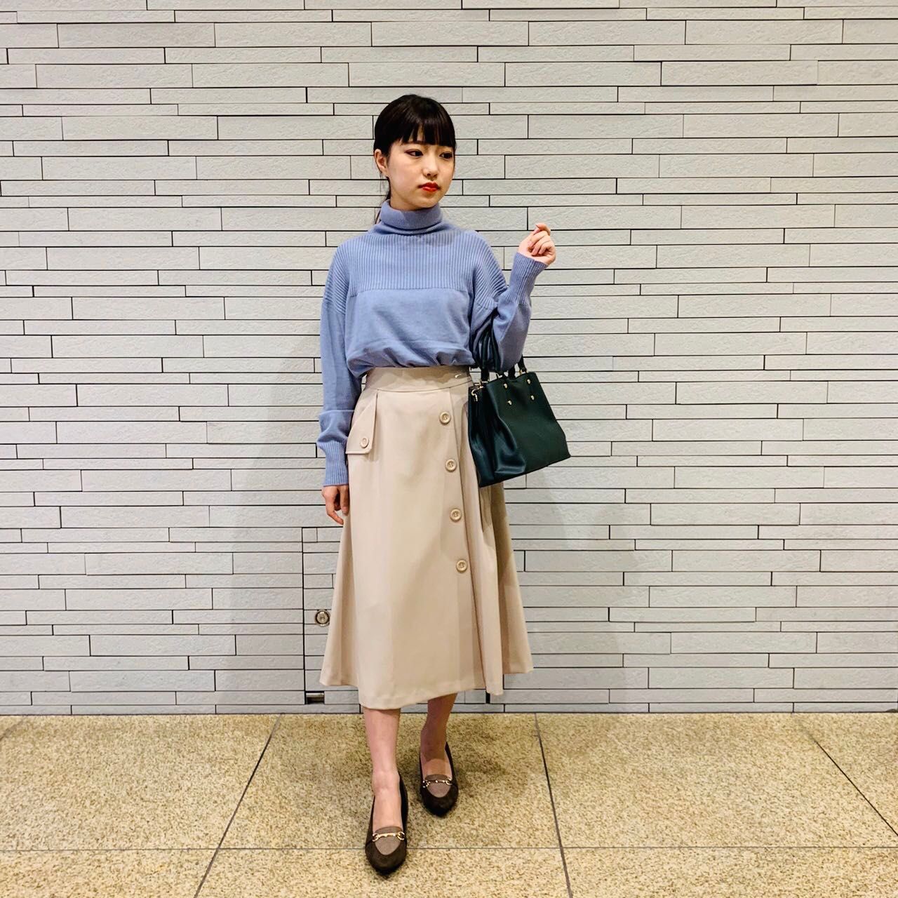 キレイ色を使ったニットと人気のミモレ丈スカートを使ったコーディネートとなっています。