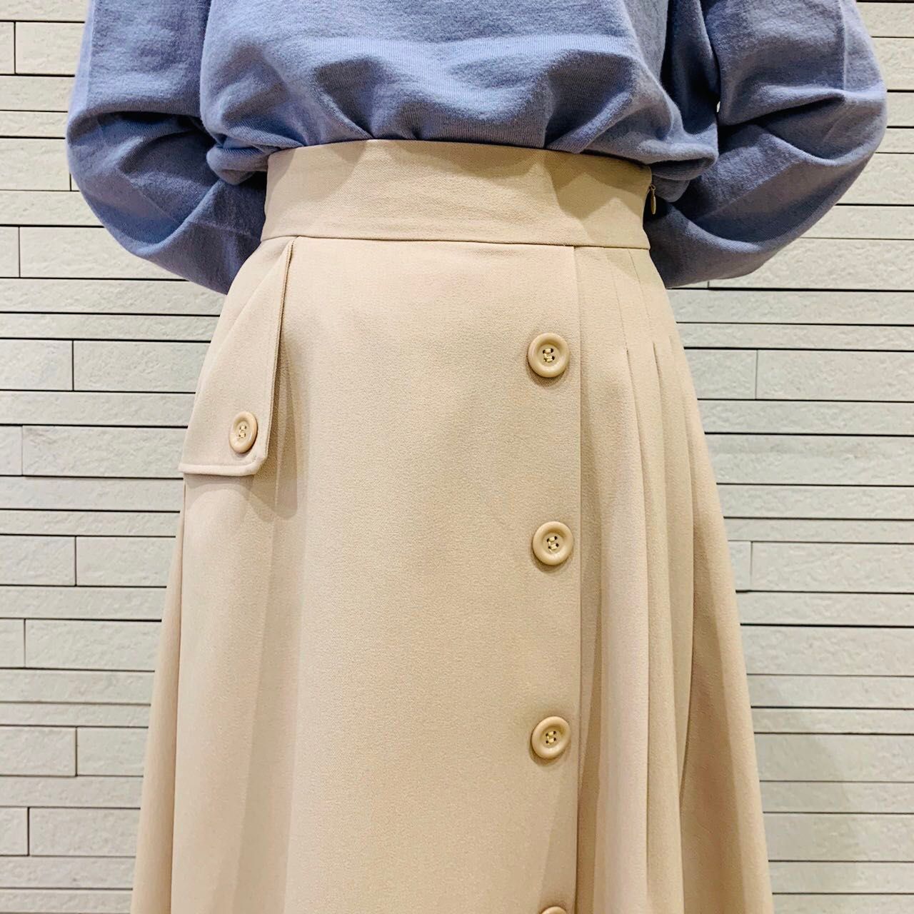 片側だけにタックを寄せたデザインでボタン使いが今年らしいスカート。ウール調の素材を使っているので今から、冬までずっと活躍しますよ!