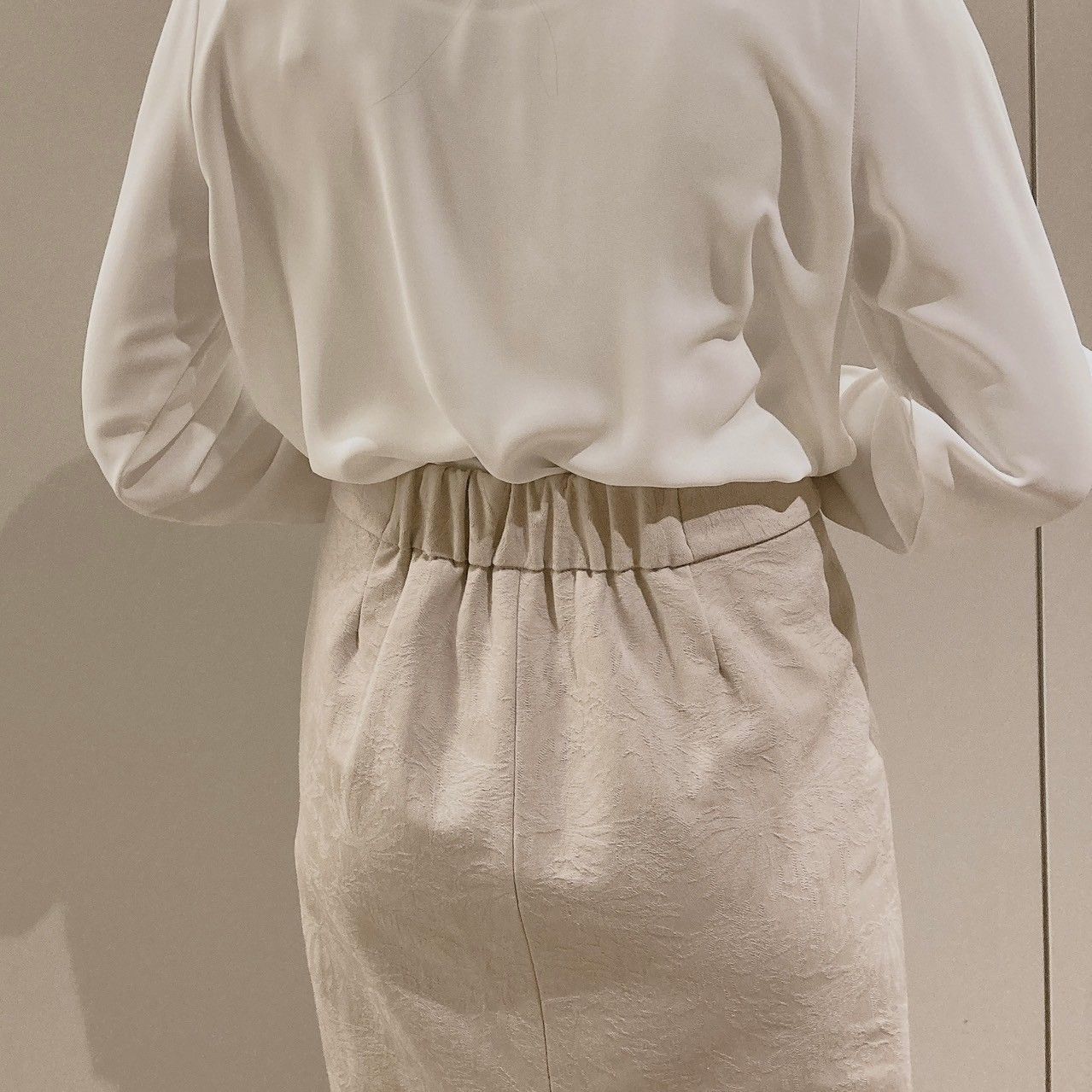 今回はシンプルなデザインのブラウスと合わせましたが、柄のアイテムでもジャガードデザインを邪魔せずお召いただけます◎