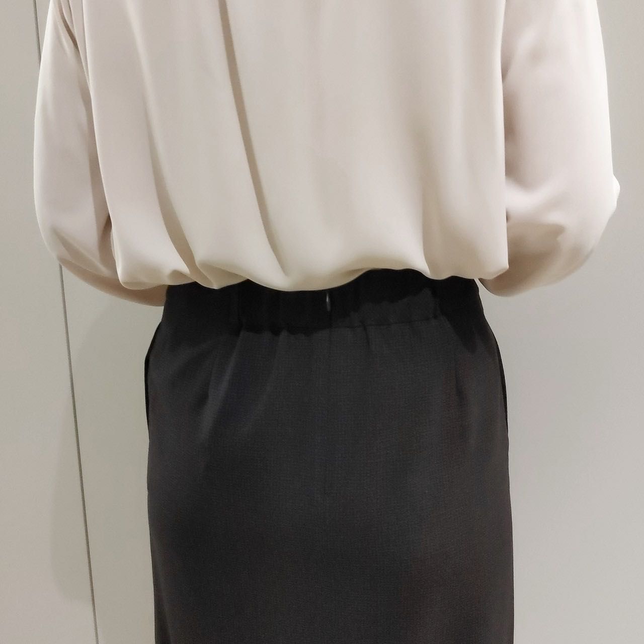 バックにはゴムが入っているため、長時間座るようなお仕事でもリラックスしてお過ごしいただけますよ◎