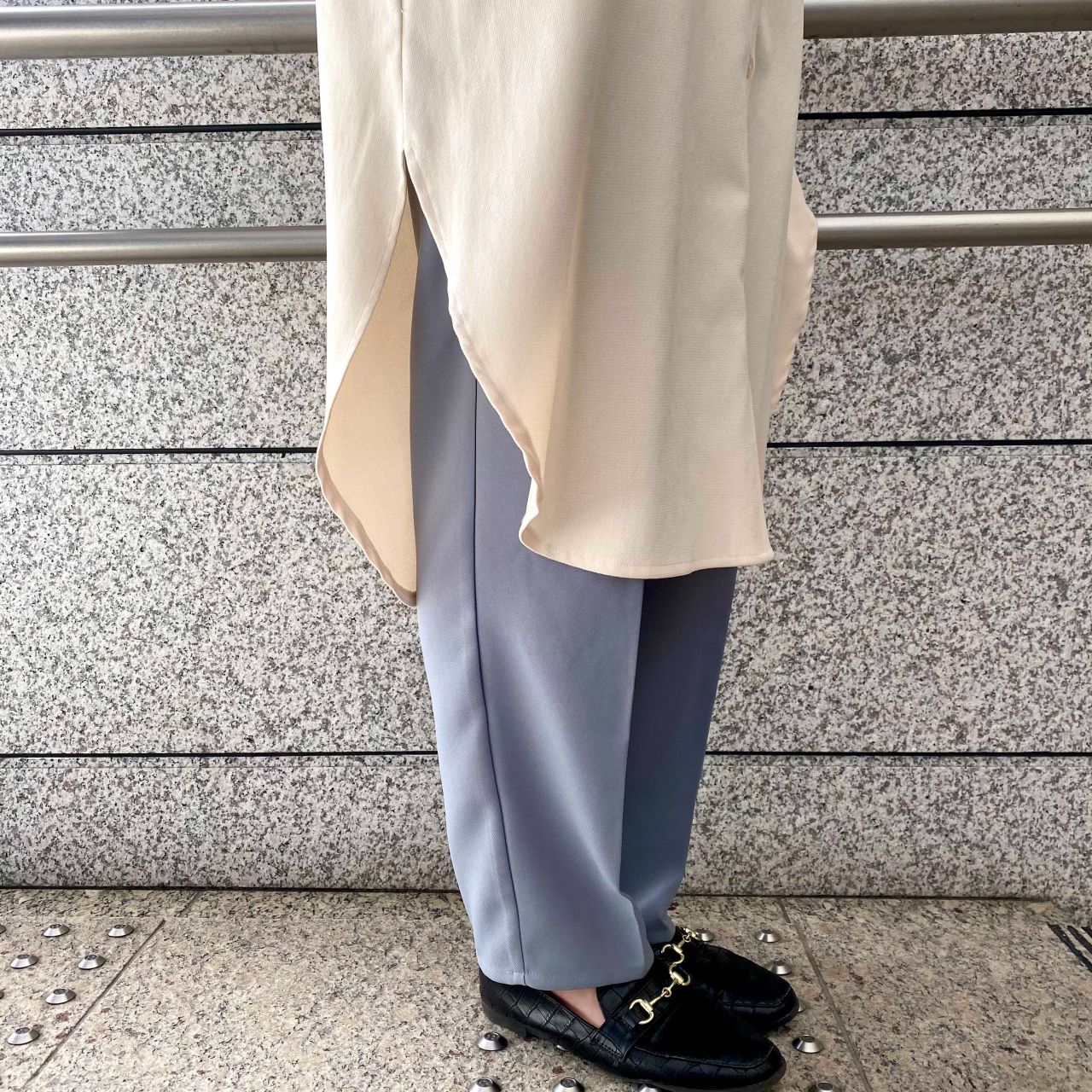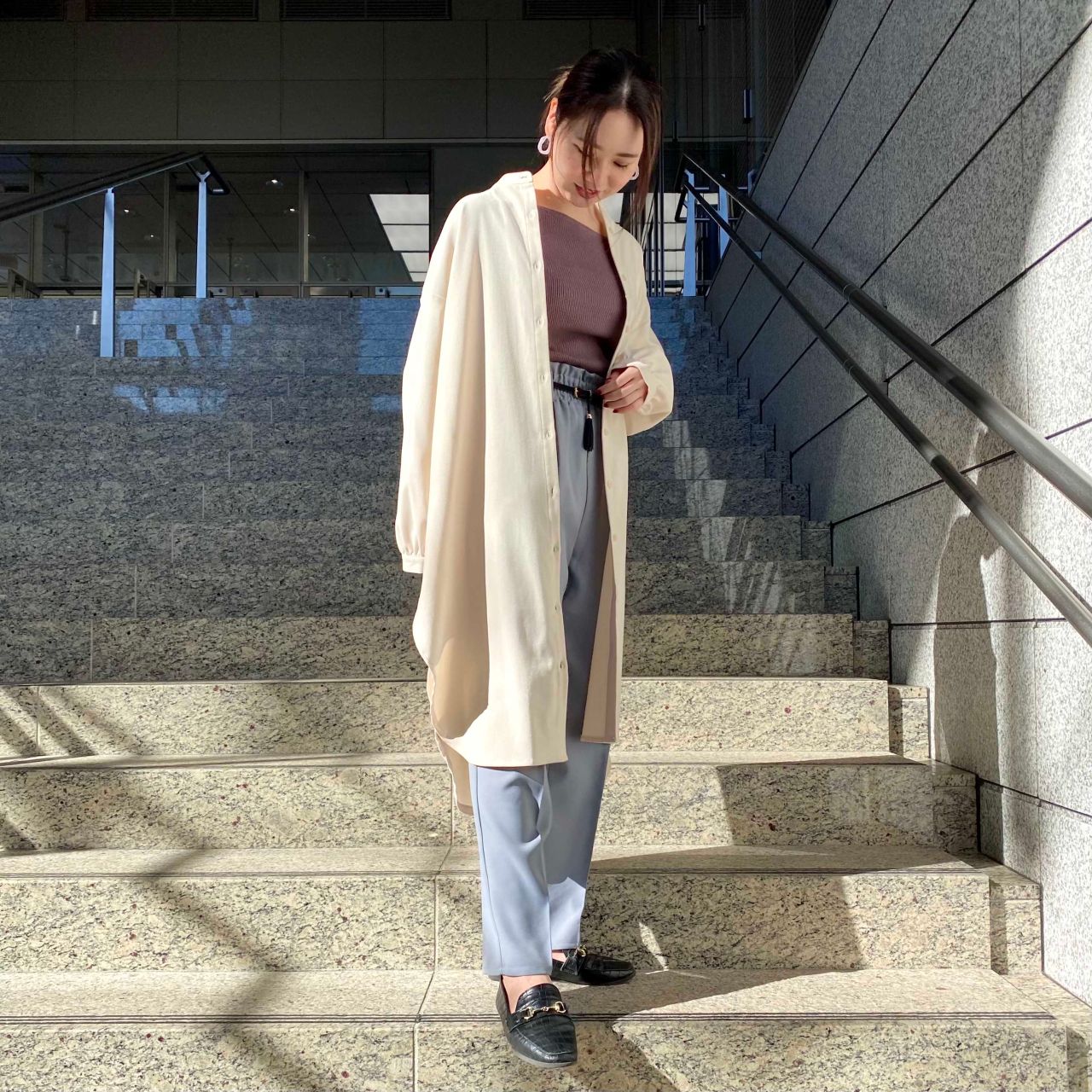 サイドに大きくスリットが入り、丸みを帯びた裾のラインになっているので、今の時期はニットとのレイヤードで着るのもオススメです!