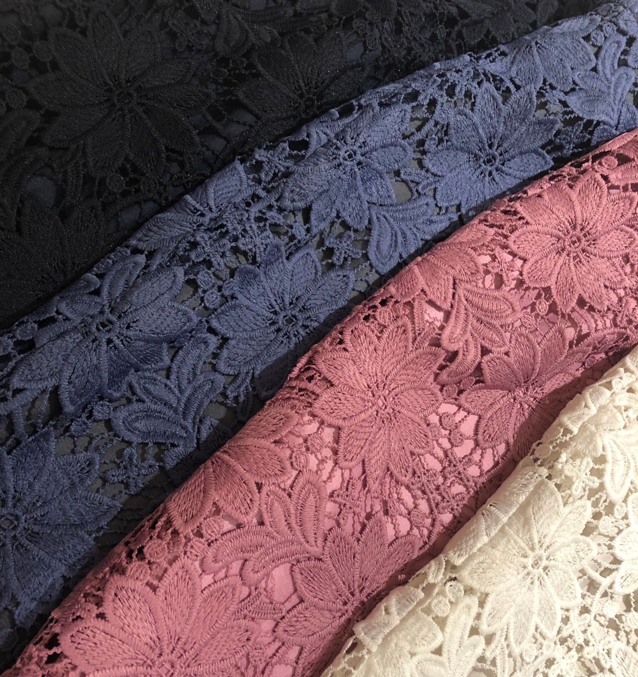 前回ご紹介したものよりも、やや生地が厚めになっていて、お花の刺繍柄がとてもキレイに出るレース素材となっています。