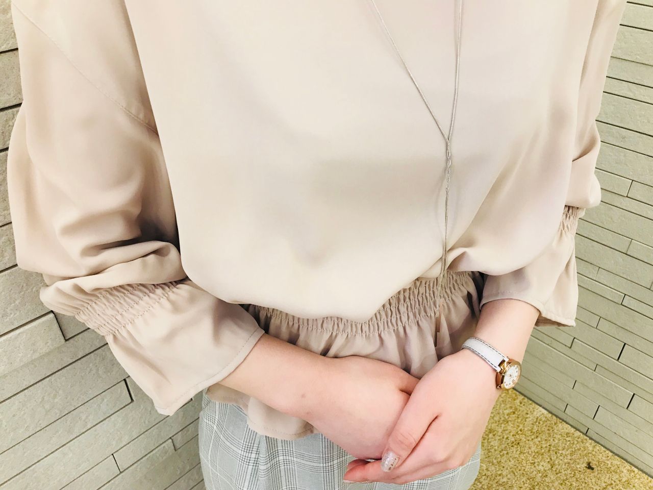ギャザーが入っており、キュッと引き締まるので綺麗なラインが出るのと、手首か少し見えることによって細くスッキリ見えます!