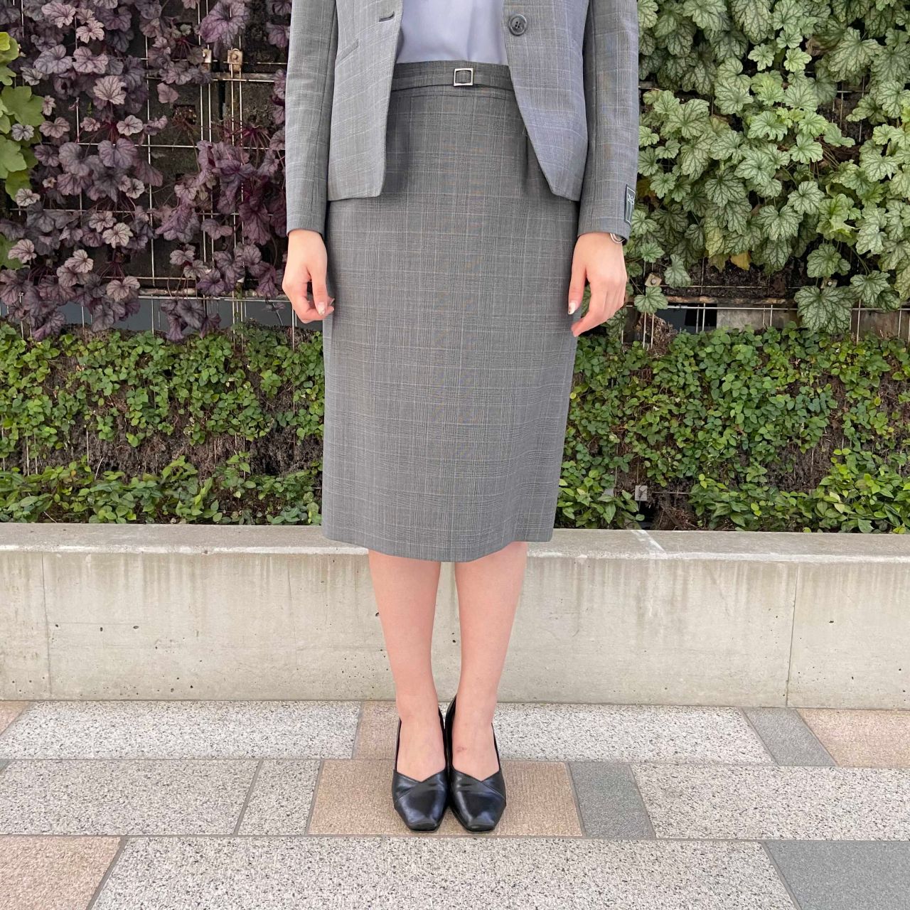 スカートの丈感は少し長めになっているので短いタイトスカートが苦手な方、座る時心配な方にはとても安心なスカートになっております!